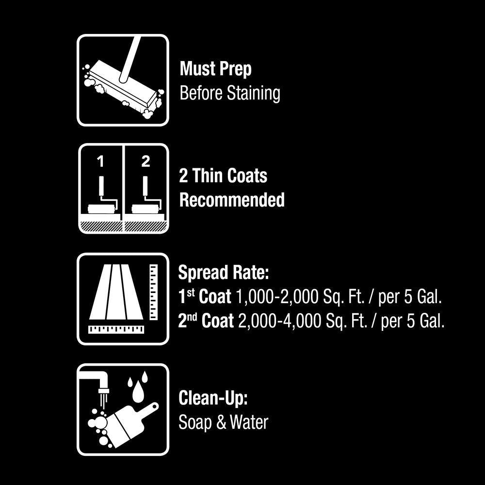Coverage area: 1st coat 1000 sq. ft. - 2000 sq. ft., 2nd coat 2000 sq. ft. - 4000 sq. ft.; avoid applying stain too heavily, 2-thin coats recommended