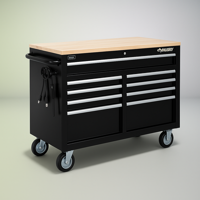 The Husky 46 in. 9-Drawer Mobile Workbench combines robust steel construction with a spacious solid wood work surface, making it ideal for any workshop or garage. With 9 lockable drawers, an integrated power strip, and heavy-duty casters, this workbench offers versatile storage, mobility, and convenience for all your projects. Its sleek all-black finish and premium features ensure both durability and style.