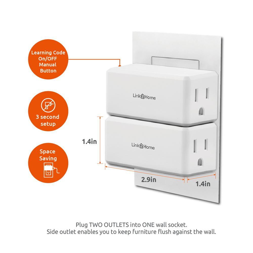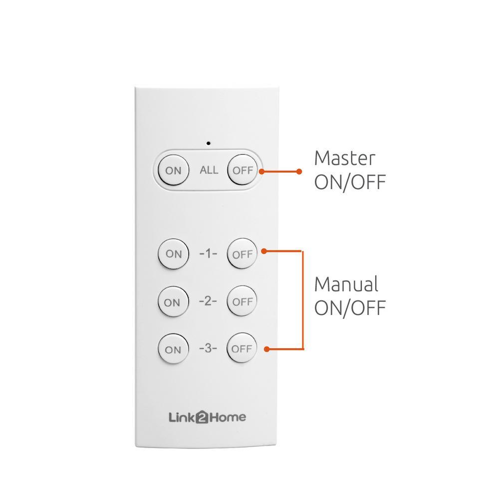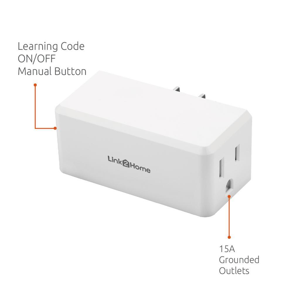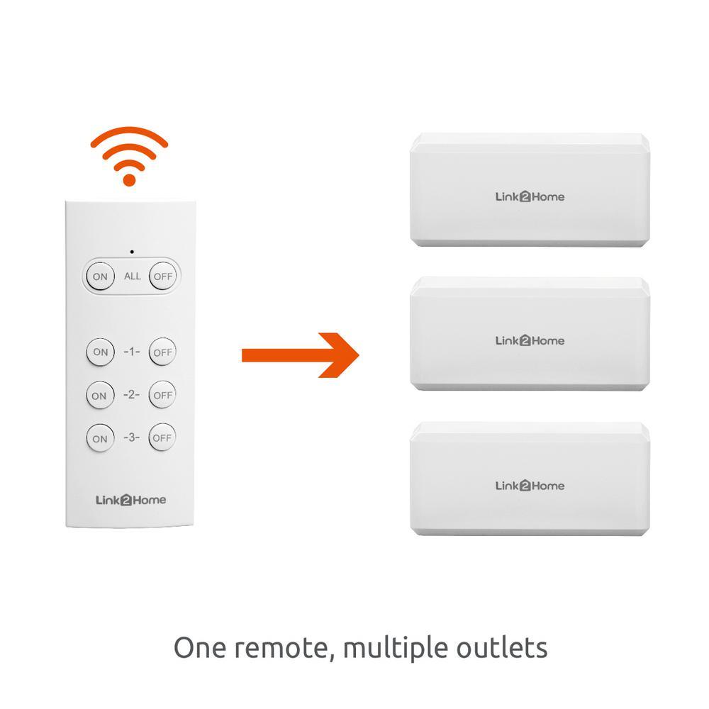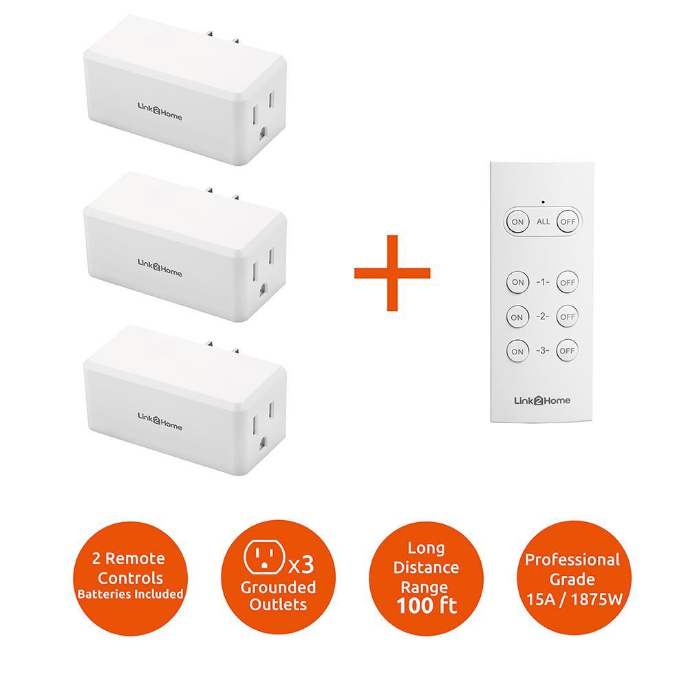 The fastest and easiest way to go smart. Link2Home Wireless Remote Control Outlet Light Switch, 3pk outlet socket with 1 remote control. Easy plug and play design. No hard-wiring or WIFI connection needed to control your lights, fans, small appliances and holiday decor. Perfect for anyone who is looking for a safer, and more convenient energy efficient solution for their home. Strong RF signal works that can reach up to 100 ft away. FCC/CSA certified. Grounded outlet 15A/125VAC. 1875 Watts heavy duty. CR2032 battery included for remote. 1 year warranty.