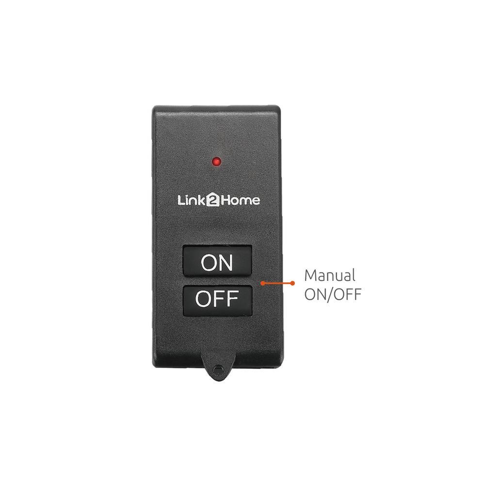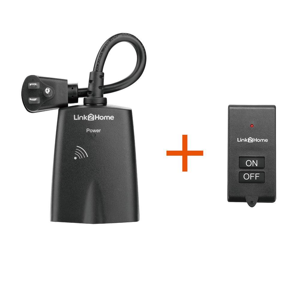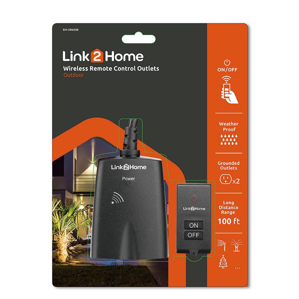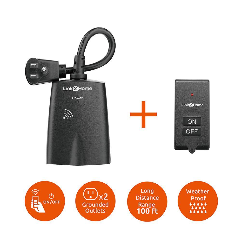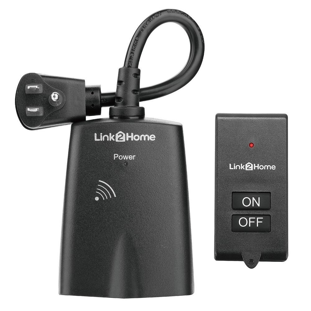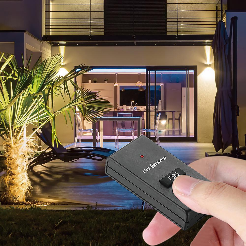 The fastest and easiest way to go smart..Link2Home Outdoor Wireless Remote Control Outlet Light Switch. Easy plug and play design. No hardwiring or WIFI connection needed to control landscape lighting, security systems, sprinkler systems or holiday lights. Perfect for those with limited mobility, the elderly or anyone looking for a safer more convenient energy efficient solution. Strong RF signal works up to 100 ft away. FCC/ETL certified. Dual grounded outlet 15A/125VAC. 1250 Watts heavy duty. CR2032 battery included for remote. 1 year warranty.
