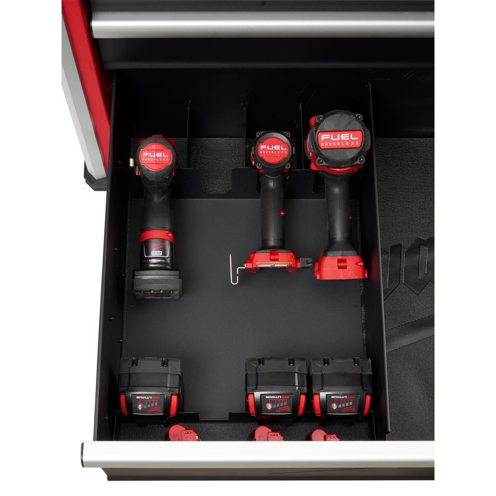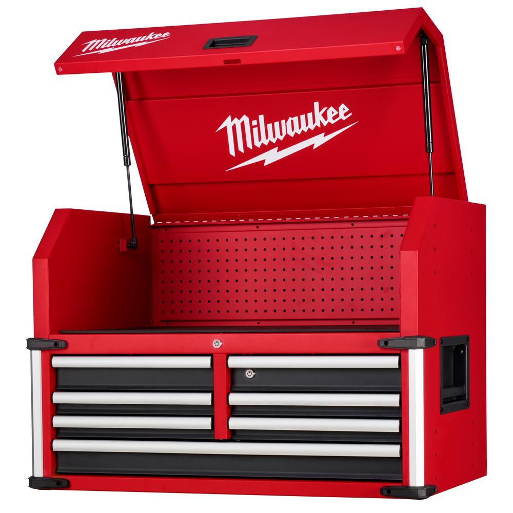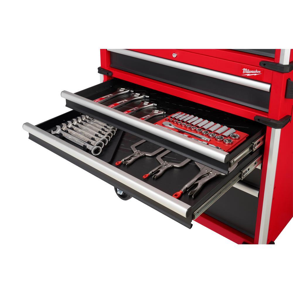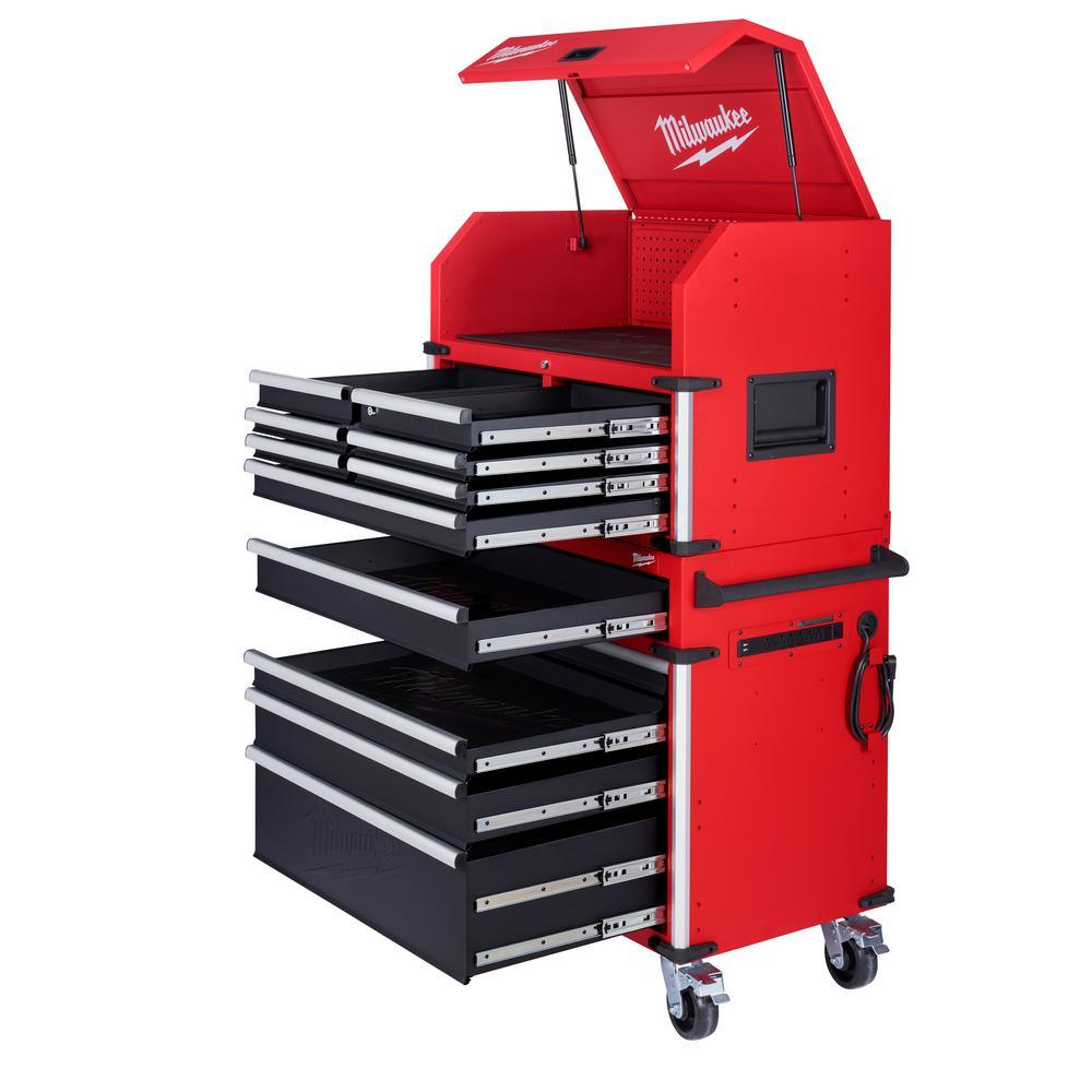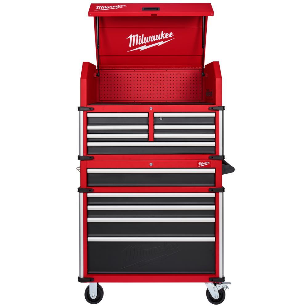 The Milwaukee 36 in. High Capacity Steel Storage Combo is the best-equipped tool storage solution in its class. The tool storage cabinet and chest provide users with a reinforced angle iron frame, 1,800 lbs. weight capacity, 18-Gauge steel construction, and 5 in. industrial-grade casters for superior durability. The rolling tool storage cabinet gives users over 27,326 cu. in. of storage space and 100 lbs. rated, soft-close drawers for smooth opening and closing. The mobile toolbox offers a variety of innovative features like a built-in power center, integrated pegboard storage, and a power tool organizer to maximize productivity.