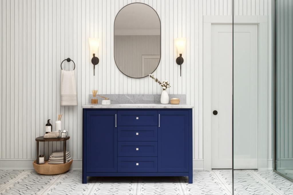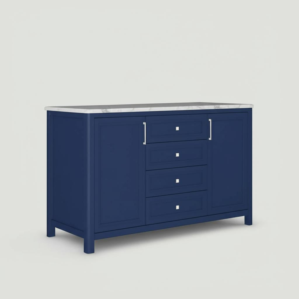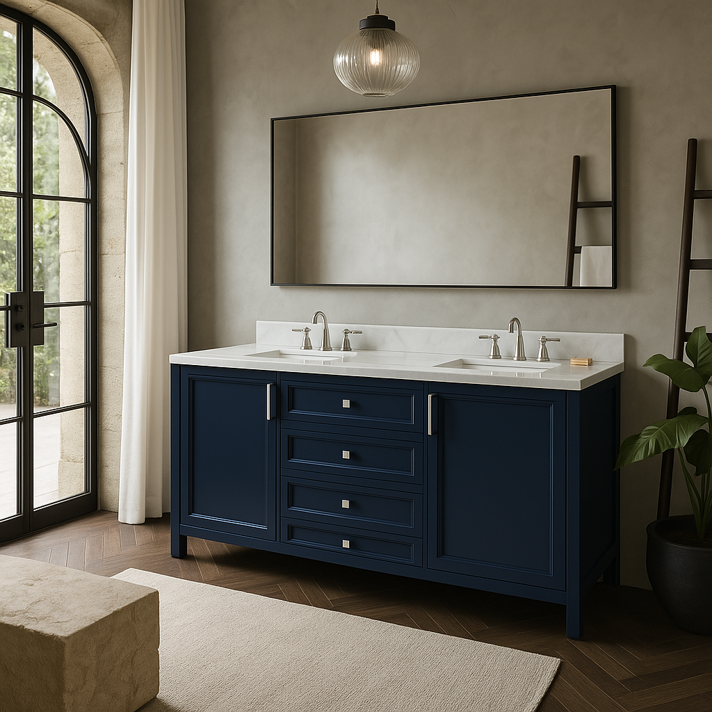 The Sandon 72-inch double sink vanity combines luxurious design with practical functionality. Featuring a midnight blue finish, Carrara marble top, and ample storage, it is the perfect centerpiece for any bathroom.