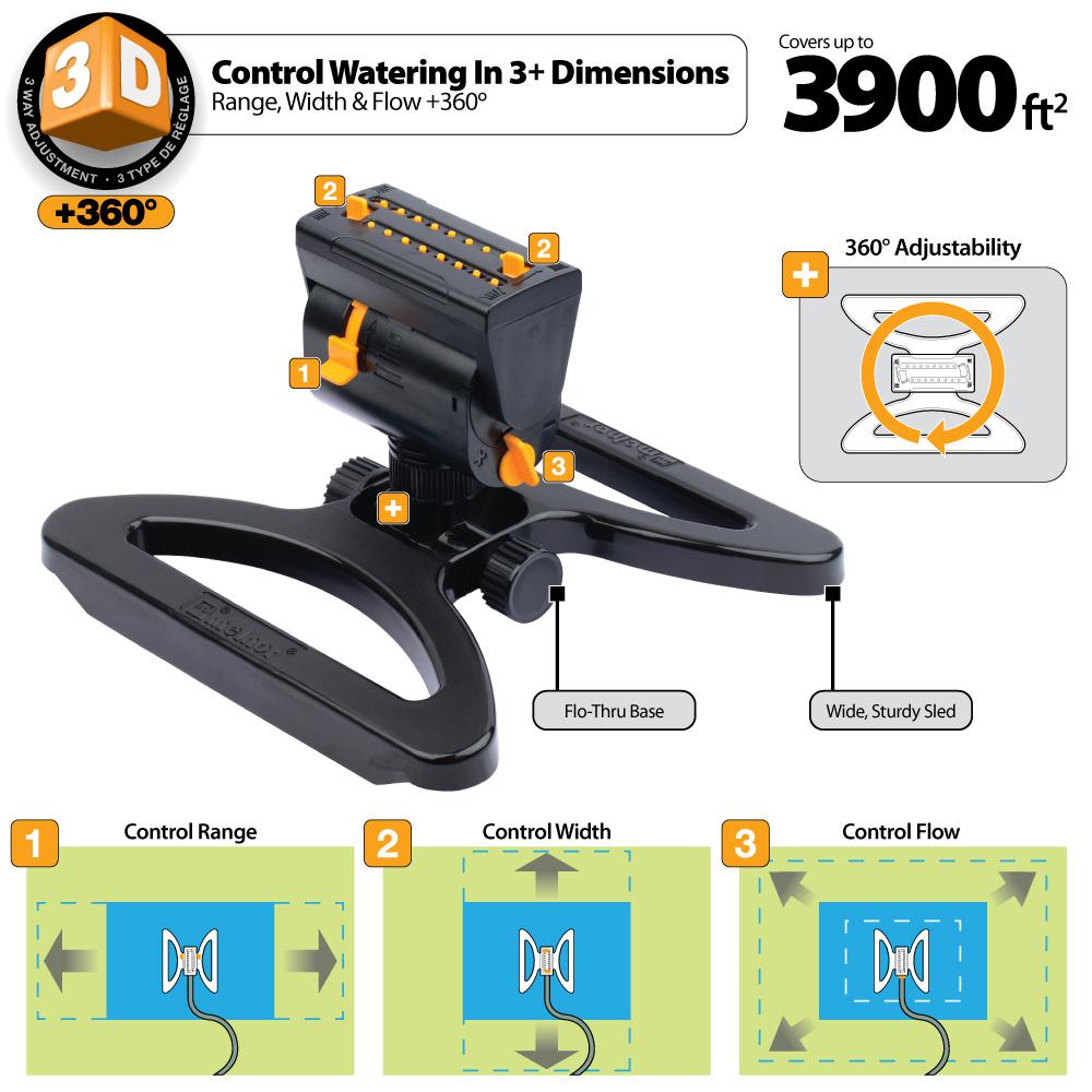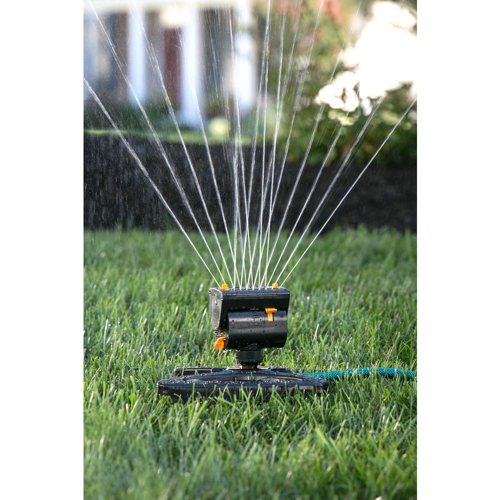 Flow-through base allows unit-to-unit connection so multiple sprinklers can be set up throughout the yard
