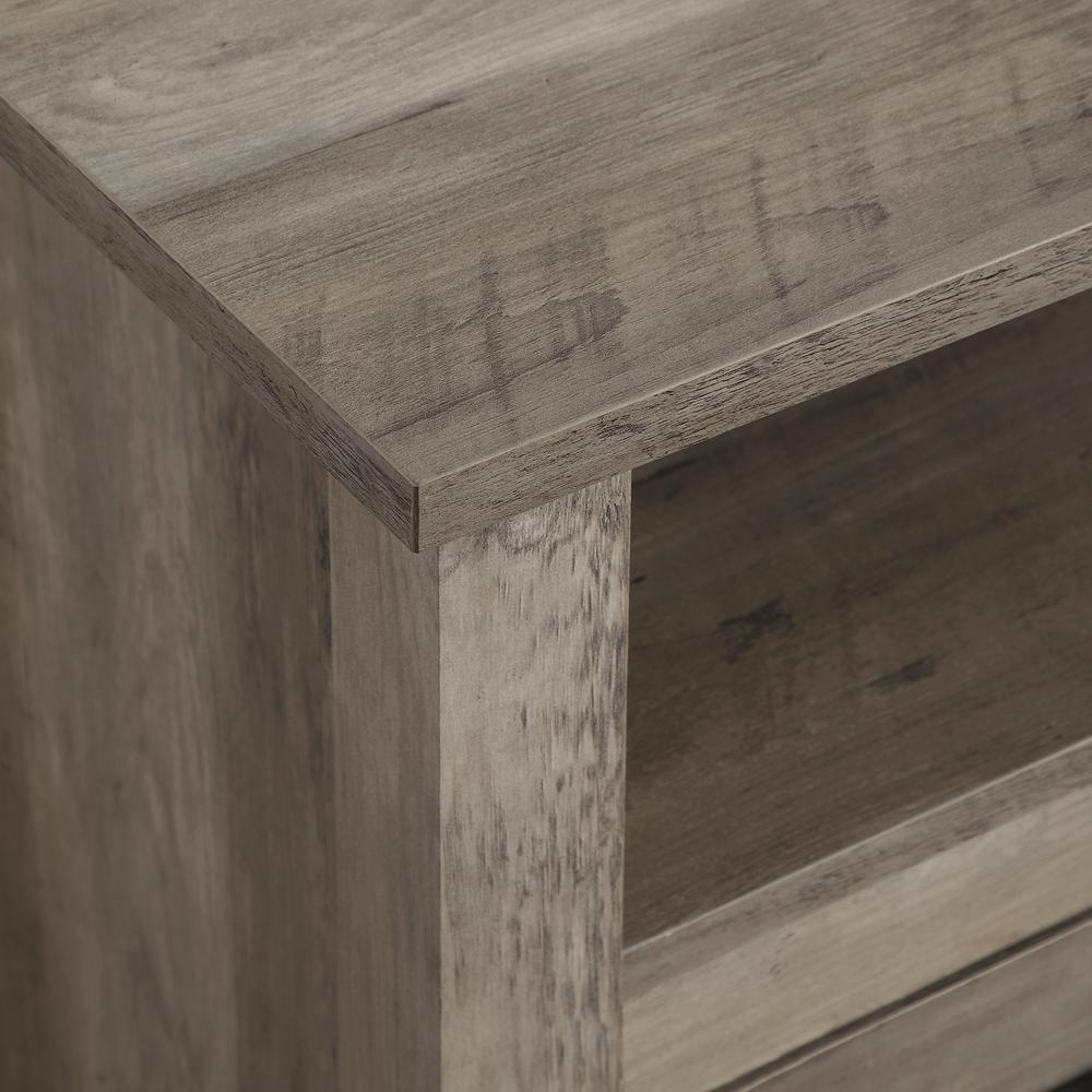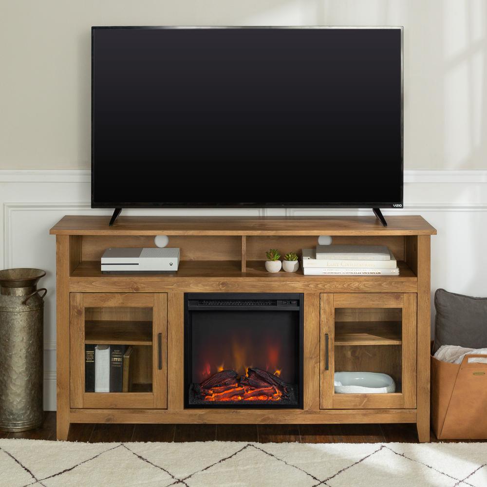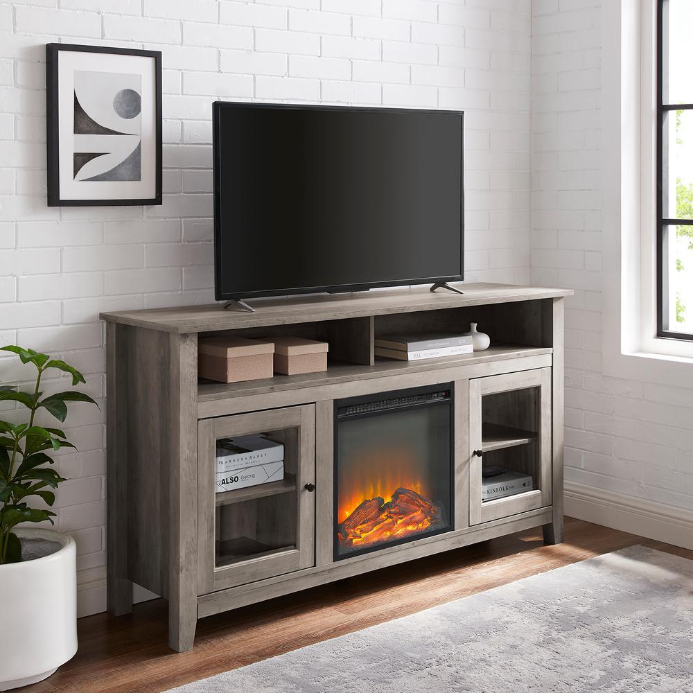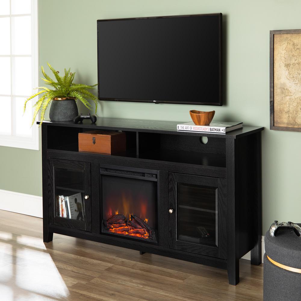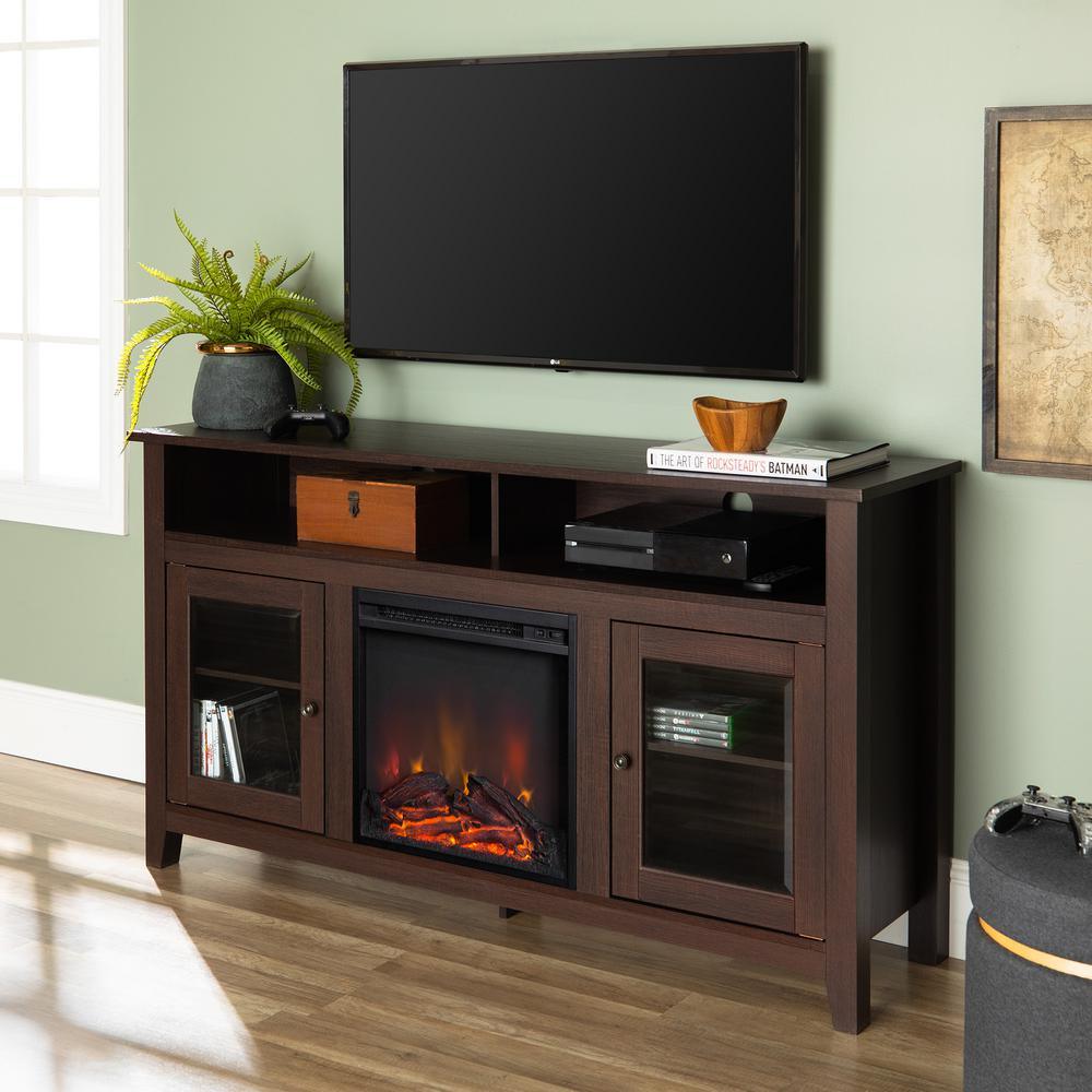 Create a cozy atmosphere with this 58 in. highboy media stand with an electric fireplace. This entertainment console is made of high-grade MDF, a warp free wood composite and finished with a premium multi-grain laminate ideal for everyday use. This stand accommodates TVs up to 64 in. It also features adjustable shelving behind 2 glass doors, open storage that fits your media components and accessories and a cable management system to maintain a tidy space. Install the electric fireplace by simply plugging it in to a standard outlet. No venting or electrician required.