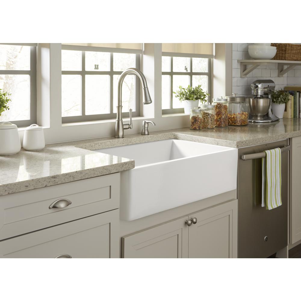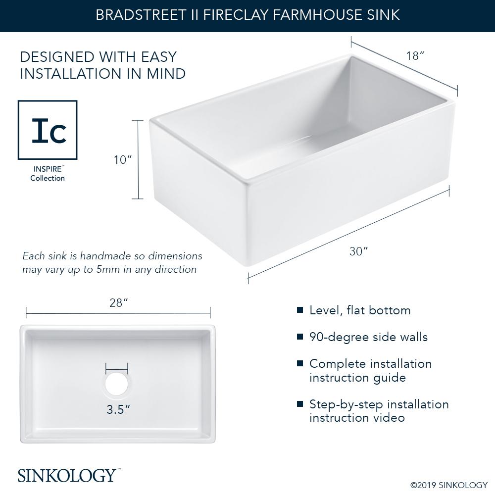 The Bradstreet II fireclay kitchen sink brings SINKOLOGYs INSPIRED collection of fireclay sinks to your home. Our handcrafted single bowl sink showcases the classic beauty of the farmhouse style with modern enhancements for ultimate functionality. The 30 in. sink is a beautiful focus point for your kitchen and provides generous space for filling pots, stacking dishes, cleaning and preparing meals. The Bradstreet II is designed to withstand the needs of a busy kitchen without sacrificing the classic look of an authentic farmhouse sink. The single bowl, apron-front sink features a crisp white finish that brings clean, timeless beauty to your kitchen. All SINKOLOGY sinks are guaranteed to not chip, crack, stain or rust and we back that promise with our exclusive SINKOLOGY Lifetime Warranty. The Bradstreet II single bowl farmhouse sink from our Iinspired collection is functional, reliable and priced with you in mind. This affordable package includes a Stainless Steel garbage disposal drain designed to work with most InSinkErator disposals.