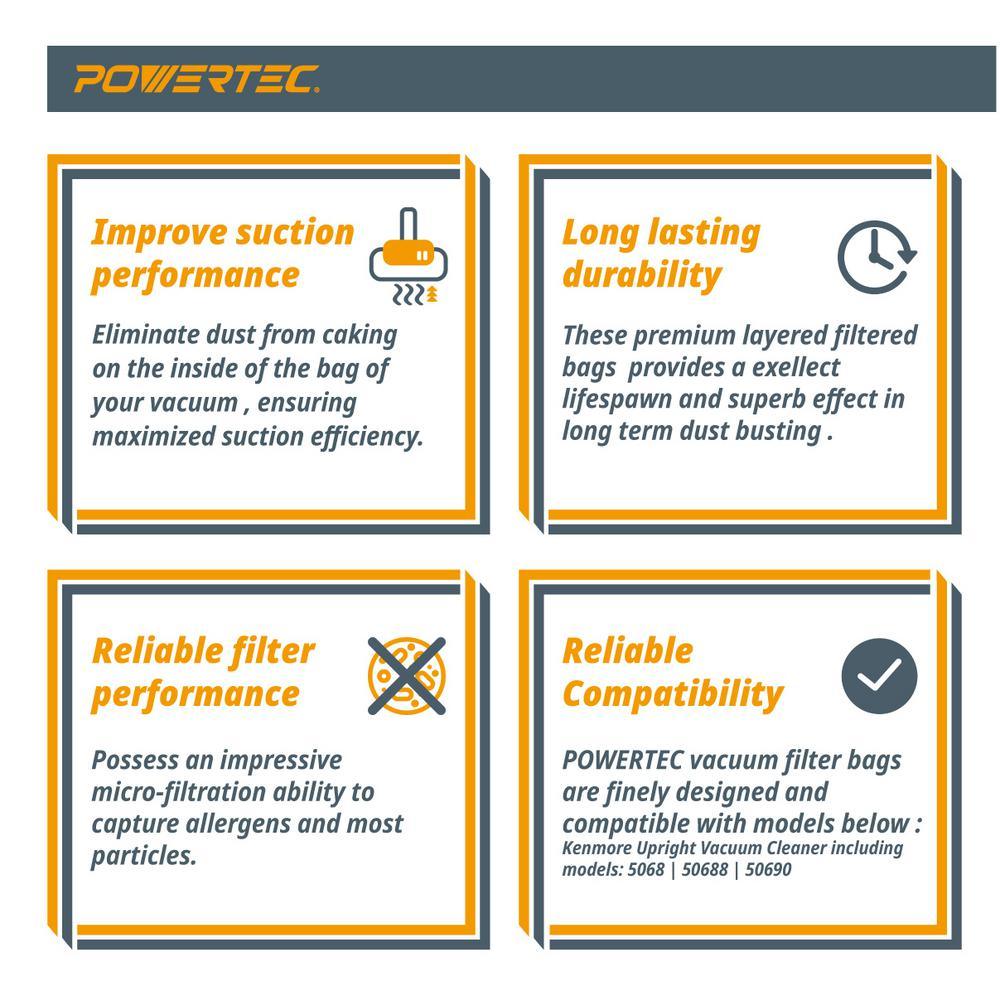 Introducing the Kenmore Type O Bags for your Kenmore Upright Vacuum by POWERTEC. These high efficiency HEPA vacuum cleaner filter bags present a premium and reliable alternative for your Kenmore Upright Vacuums. Perfectly suited to extract an assortment of dust, pollutants, allergens and small particulate matter, these Kenmore Vacuum bags O style are heavy-duty and work flawlessly to ensure a healthy, clean and neat environment. They feature a unique design that eliminates clogging or blockage, preventing your vacuum from overfilling. Not only are they easy to install, but when your vacuum is full, you will find these Kenmore type O bags conveniently simple to replace. Made from a premium 6 ply HEPA grade material, they are 100% disposable, allowing you to toss and discard for a fast and easy clean-up. Quick, easy, effective and done with. These cost effective Kenmore Style O Vacuum bags shop vac filters serve as premium OEM replacements for Kenmore Upright Vacuum Bags 5068, 50688 and 50690.