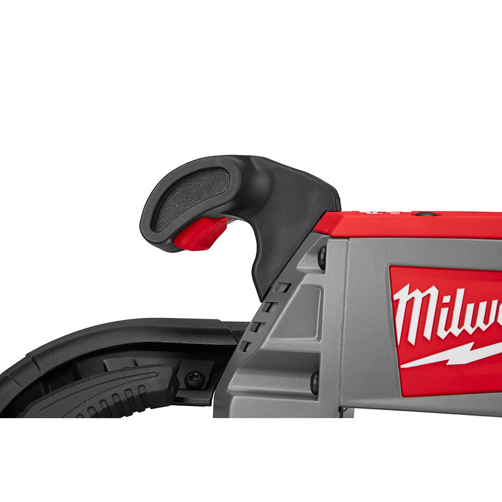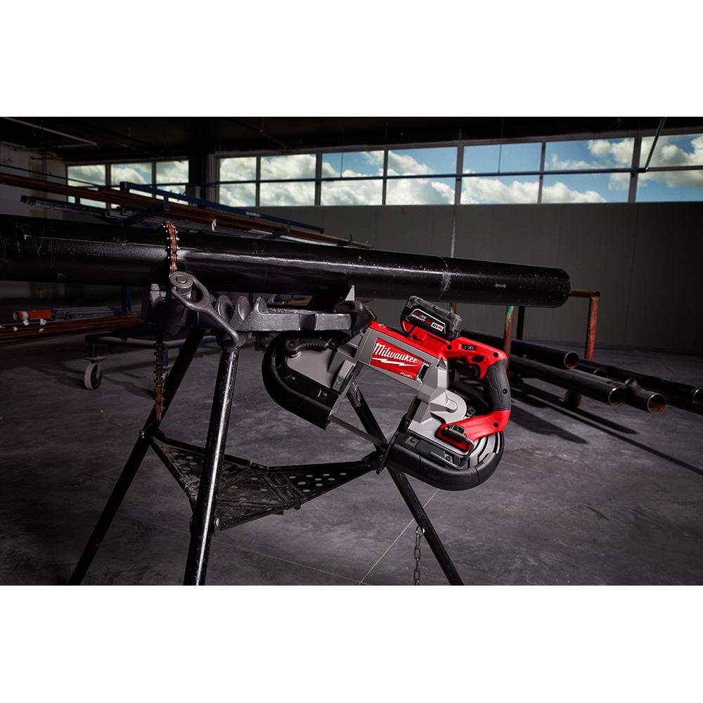 The Milwaukee M18 FUEL Deep Cut Dual-Trigger Band Saw cuts faster than its corded counterparts and features a Dual-Trigger design for safe cutting. The deep cut band saw gives users the largest capacity of 5 in. x 5 in. for maximum productivity. Utilizing a POWERSTATE Brushless motor and Constant Power Technology, the cordless band saw cuts faster than corded band saws. This band saw also incorporates a Dual-Trigger design which requires 2-handed operation. It is equipped with Jobsite Armor Technology, protecting the user's tool from drops and debris with a proprietary composite material and crush zone barriers to absorb impacts. REDLITHIUM XC5.0 Battery Technology (not included) provides users with up to 2.5X more run-time through superior pack construction, electronics and more work per charge over the life of the battery than any competitive lithium-ion battery on the market. REDLINK PLUS Intelligence has the most advanced system of cordless power tool electronics, providing users with optimized performance, electronic clutch and overload protection using total system communication between tool, battery and charger. The portable deep cut band saw features a tool-free locking adjustable shoe that can adjust from an extended shoe to no shoe in seconds. The band saw also includes a hanging hook for easy storage in-between cuts, LED light to illuminate the user's cutting area, superior cut visibility and balanced body design.