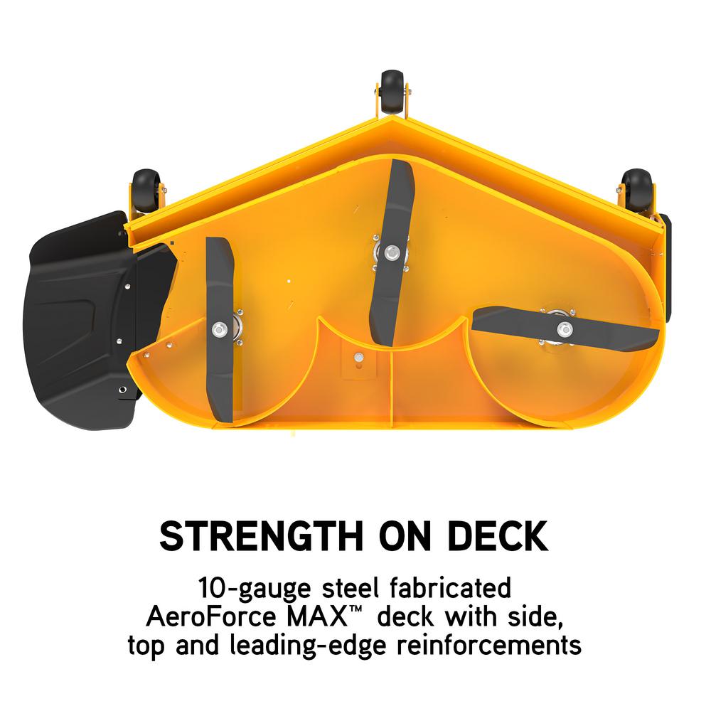 - 60 in. AeroForce Max 10-Gauge reinforced fabricated steel cutting deck with maintenance free spindles, smooth arc triple-blades, cut overlap and deep dome deck design provide flawless results, mows a wide area of grass to help reduce cutting time, rust-resistant and helps resist corrosion and provides your lawn with a clean-cut look