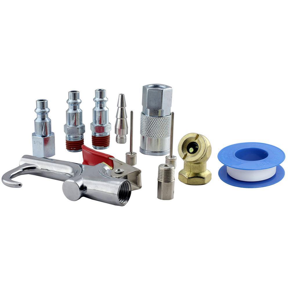 The NuMax S3GICK 3 Gal. 1/2 HP Portable Electric Oil-Free Pancake Air Compressor with 25 ft. Air Hose and 11-Piece Inflation Kit is ideal for supplying power to your pneumatic tools as well as handling all your inflation needs. The compressor contains an oil-free 1/2 HP electric motor for less maintenance, with thermal overload protection to safeguard against overheating and extend the life of the motor. The steel 3 Gal. pancake tank is compact and durable and does not require much space to get the job done. The 2-Gauge for tank pressure and output air pressure are easy to read and the convenient easy carry handle makes transporting the lightweight compressor a breeze. The drain valve and safety valve are durably constructed of brass to resist rust and corrosion and a universal quick connect coupler makes it fast and easy to hook up your air powered tools. 3 no mar anti-vibration rubberized feet on the compressor prevent it from moving around, provide excellent stability and make it safe to use even on finished flooring surfaces. This 3 Gal. 1/2 HP Portable Electric Oil-Free Pancake Air Compressor Kit includes a 25 ft. air hose and an 11-piece inflation kit and is covered by NuMax's 1-year Limited Warranty.