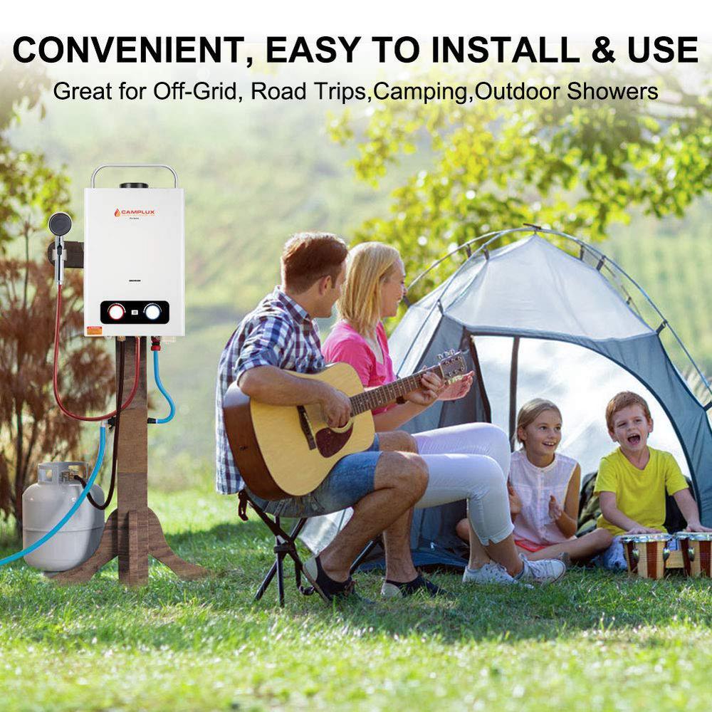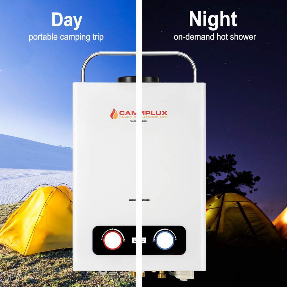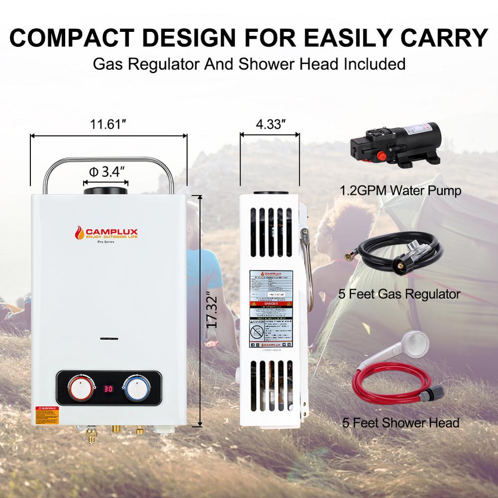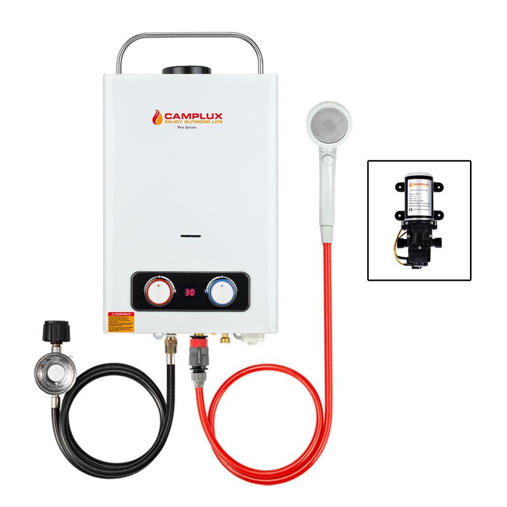 The 1.58 GPM Camplux BD158 portable tankless water heater and 1.2 GPM Water Pump are perfect for campsites, cabins, or simply around the house. Wash your car, wash your boat, take a hot shower, wash the dogs or the horse. The ignition is powered by 2 pieces of 2 D cell batteries so it makes it great for off grid or other areas where electricity is not readily available. The ideal operating range for the 1.58 GPM Camplux portable tankless water heater is 3.0110.0 psi .Available in liquid propane only.