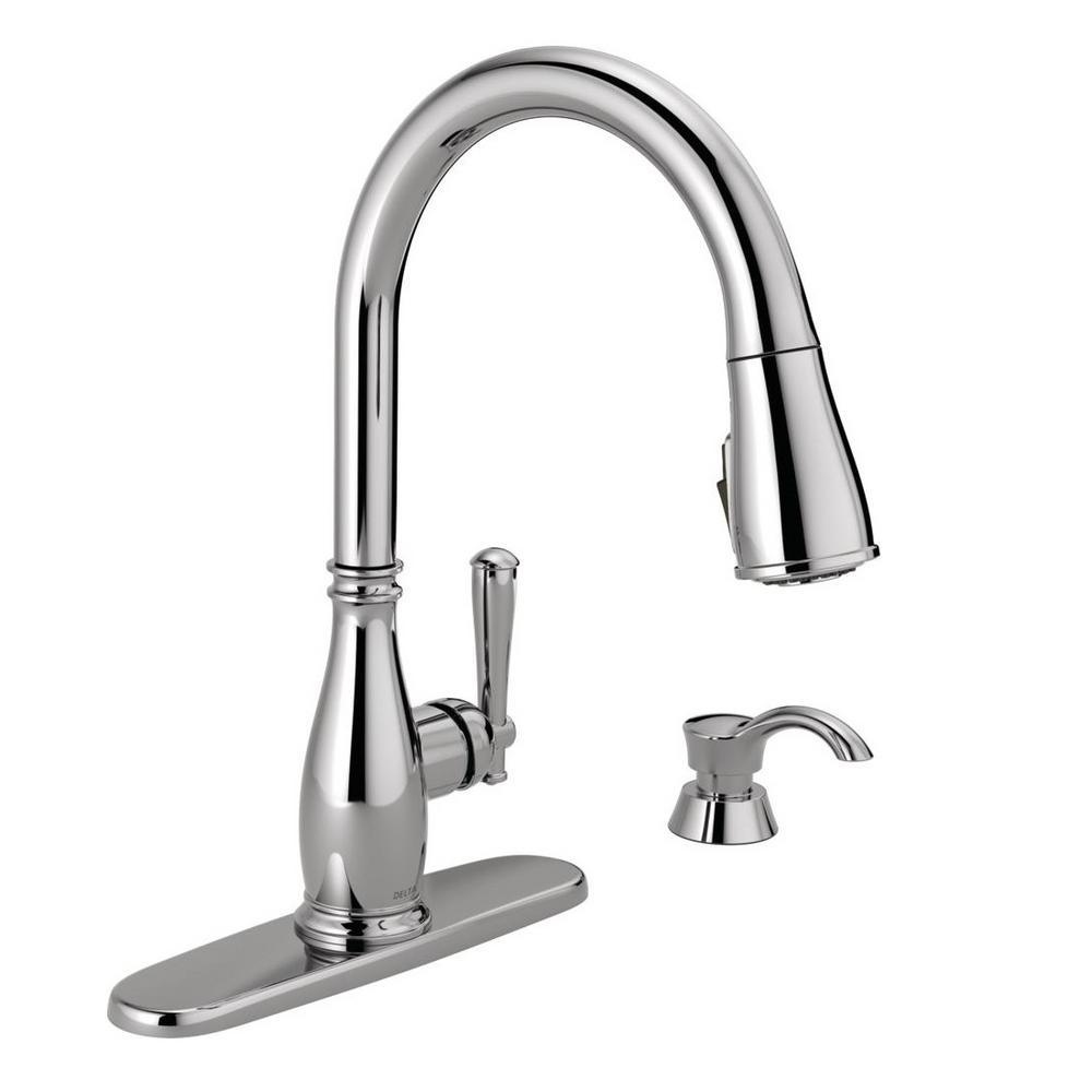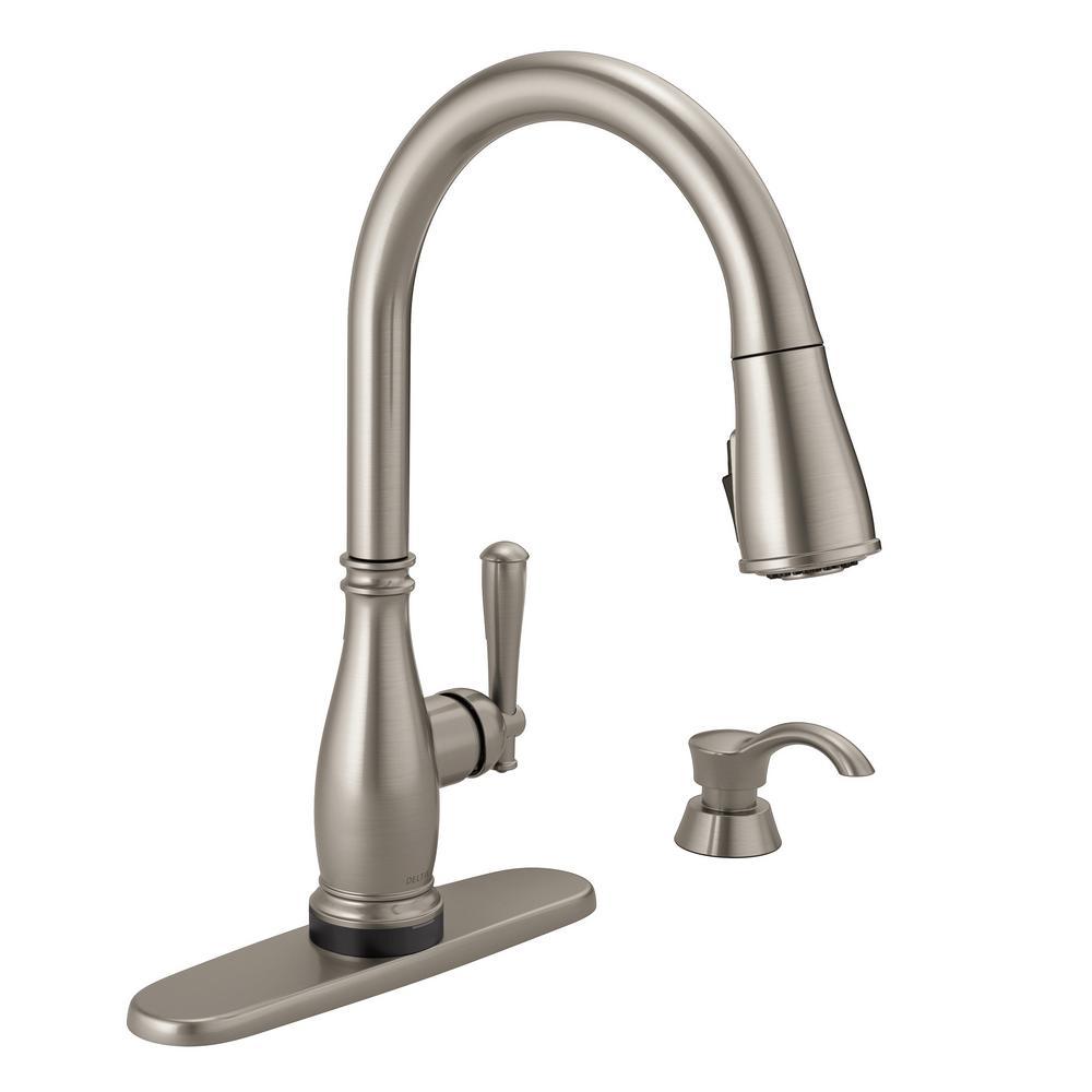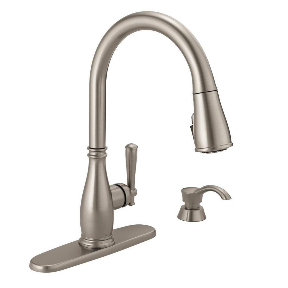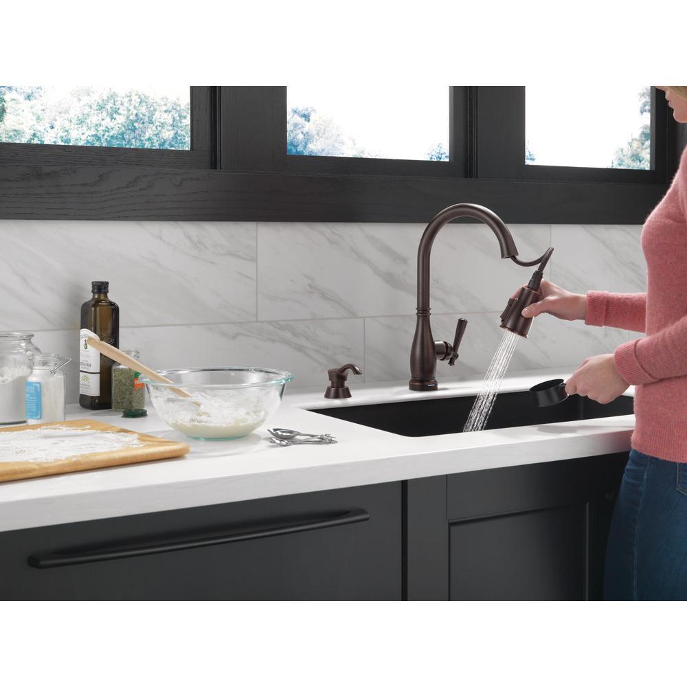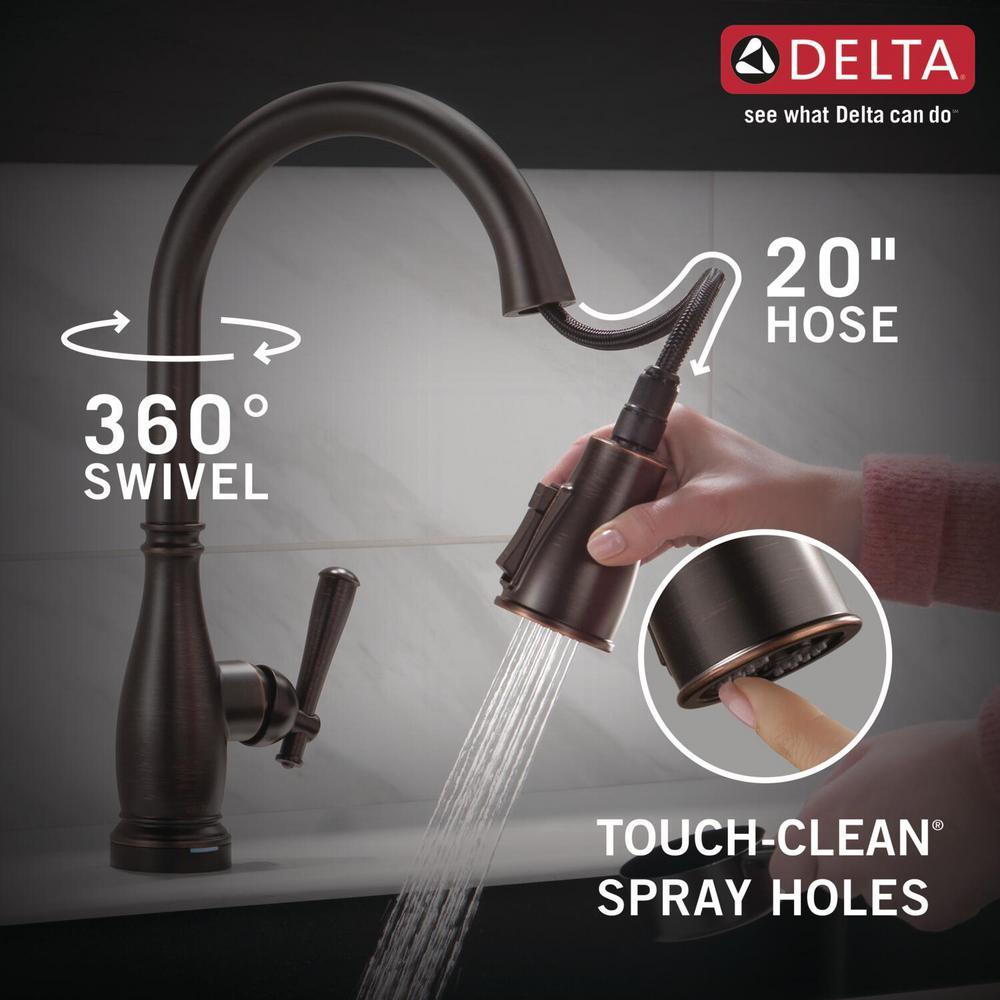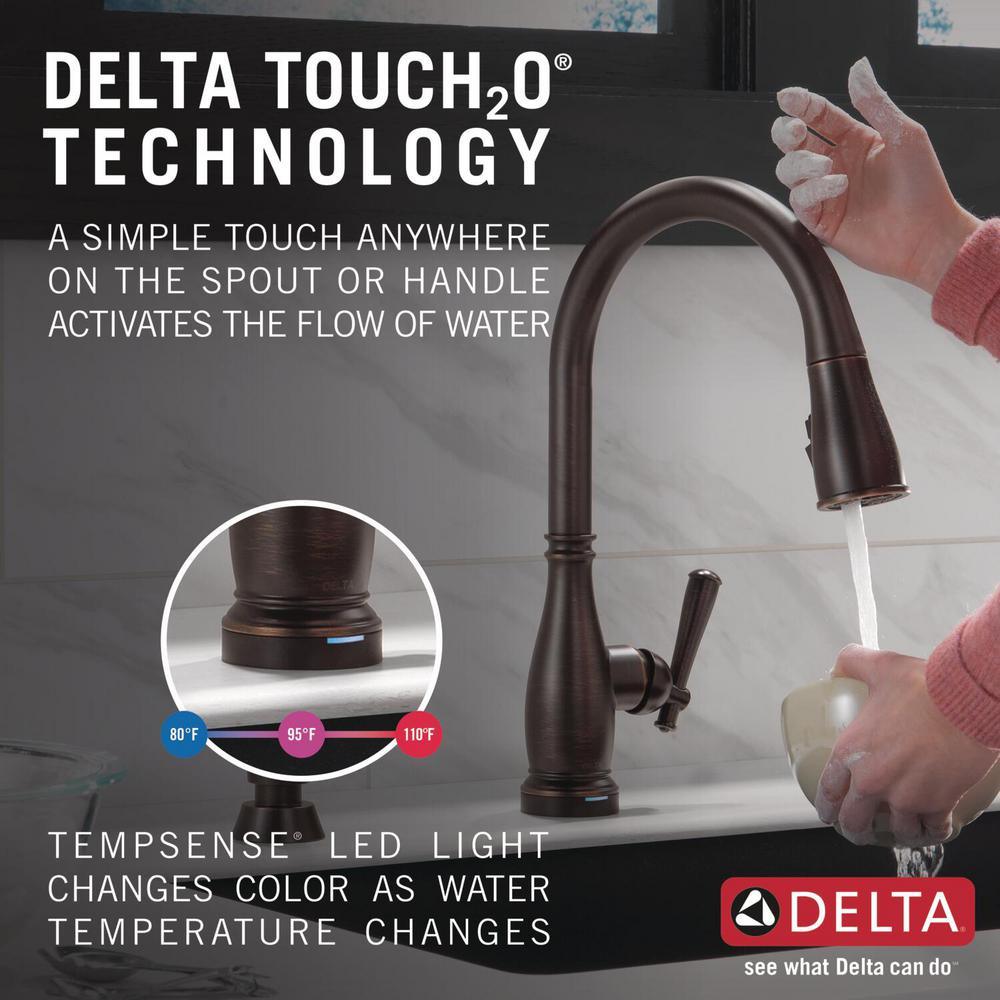 Touch it on. Touch it off. Whether you have 2 full hands or 10 messy fingers, Delta Touch2O Technology helps keep your faucet clean, even when your hands aren’t. A simple touch anywhere on the spout or handle with your wrist or forearm activates the flow of water at the temperature where your handle is set. The Delta TempSense LED light changes color to alert you to the water’s temperature and eliminate any possible surprises or discomfort. Delta MagnaTite Docking uses a powerful integrated magnet to pull your faucet spray wand precisely into place and hold it there so it stays docked when not in use. Delta ShieldSpray Technology cleans with laser-like precision while containing mess and splatter. A concentrated jet powers away stubborn messes while an innovative shield of water contains splatter and clears off the mess, so you can spend less time soaking, scrubbing and shirt swapping. Delta faucets with DIAMOND Seal Technology perform like new for life with a patented design which reduces leak points, is less hassle to install and lasts twice as long as the industry standard. Kitchen faucets with Touch-Clean Spray Holes allow you to easily wipe away calcium and lime build-up with the touch of a finger. You can install with confidence, knowing that Delta faucets are backed by our Lifetime Limited Warranty. Electronic parts are backed by our 5-year electronic parts warranty. Industry standard is based on ASME A112.18.1 of 500,000 cycles.