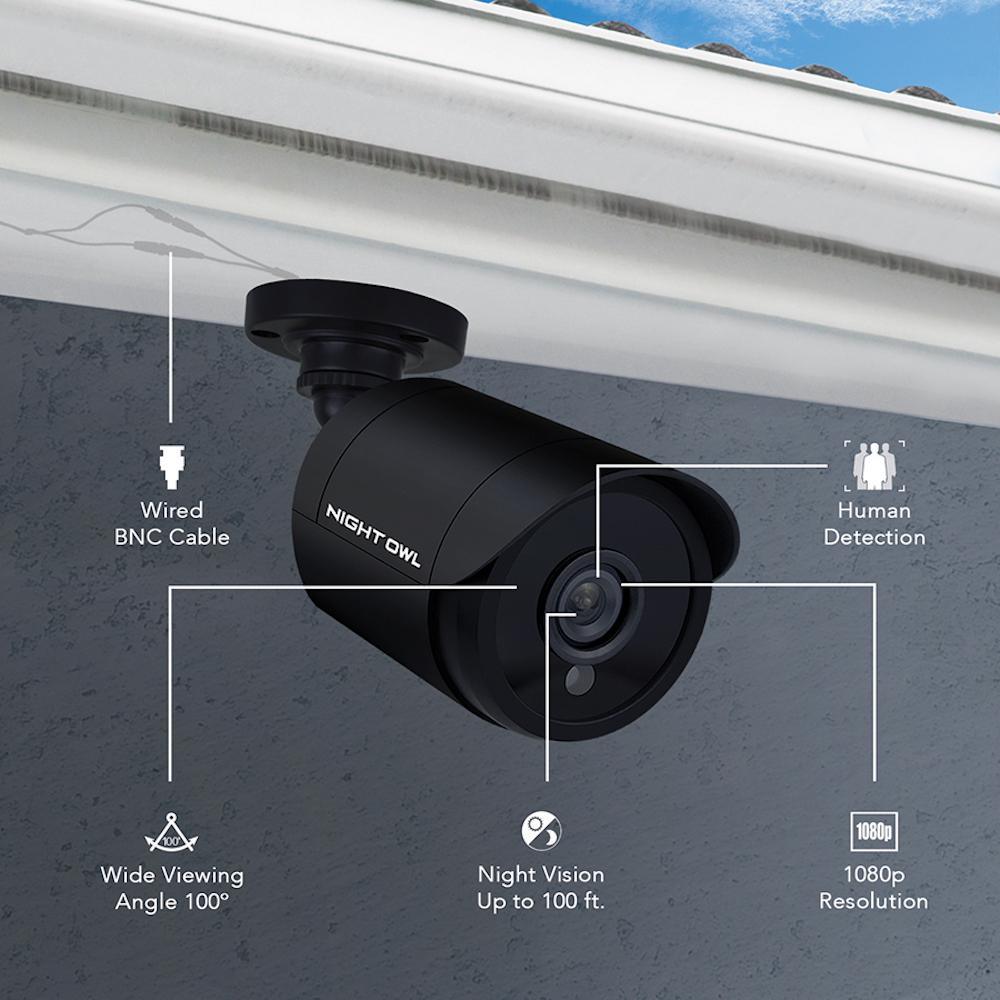 - 1080p HD wired cameras - human detection technology reduces false alerts to your smart device, uninterrupted viewing and recording, night vision with up to 100 ft. of visibility, no interference from Wi-Fi devices, internet only required for remote viewing and receiving alerts to a smart device