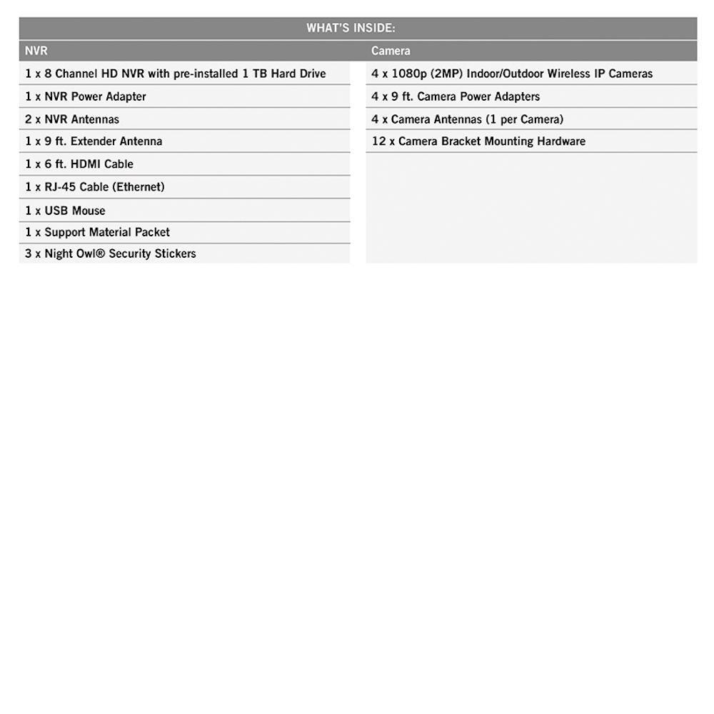 2-Way Intercom Camera,3-Axis Adjustable Camera,Accepts Additional Cameras,Built-in Speaker,Day/Night Mode,Microphone,Motion Activated,Night Vision,Programmable,Recordable,Visual Alert,Wide-Angle,Wireless Camera Compatible |