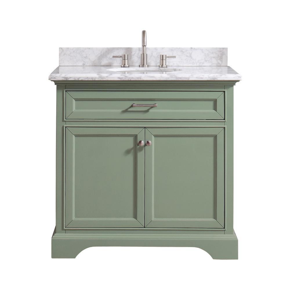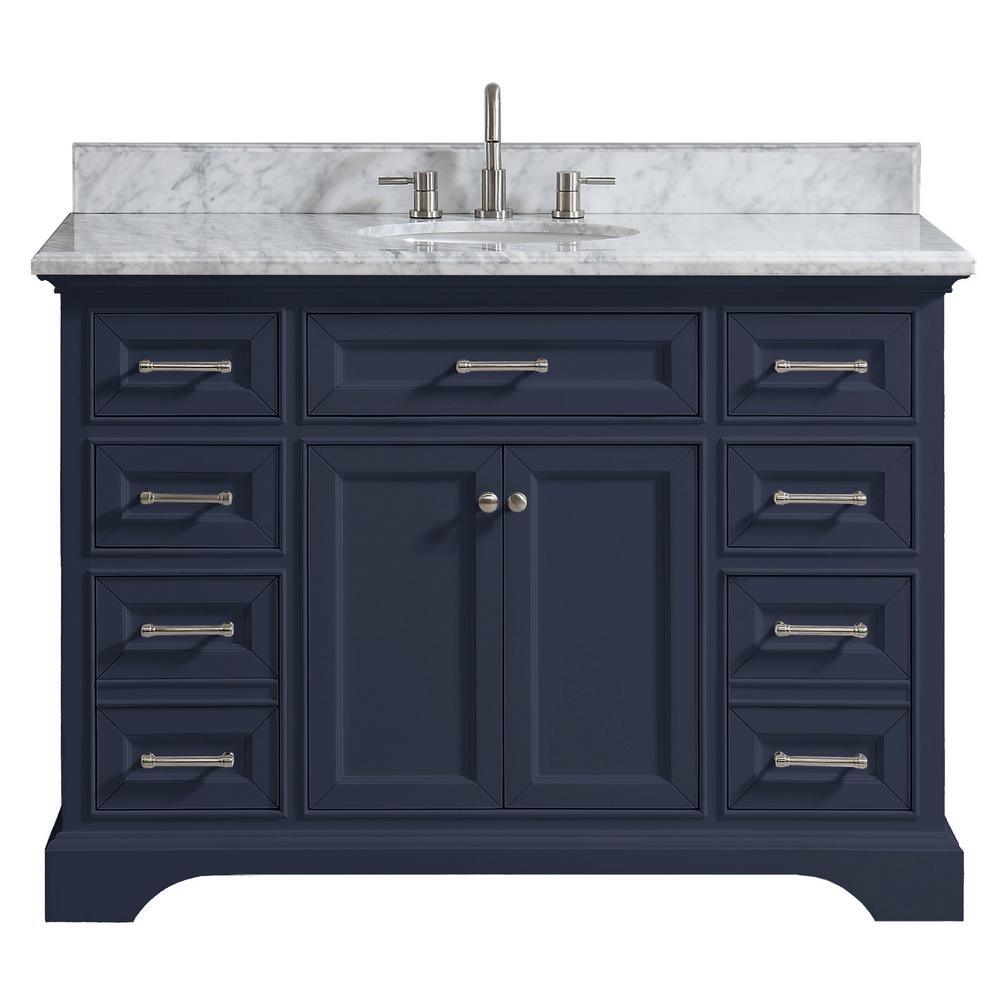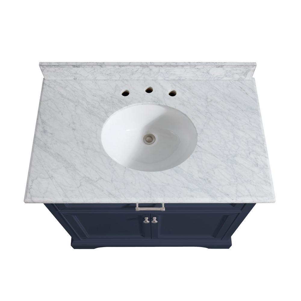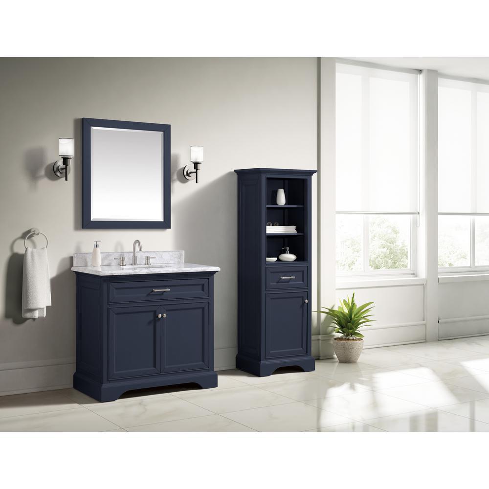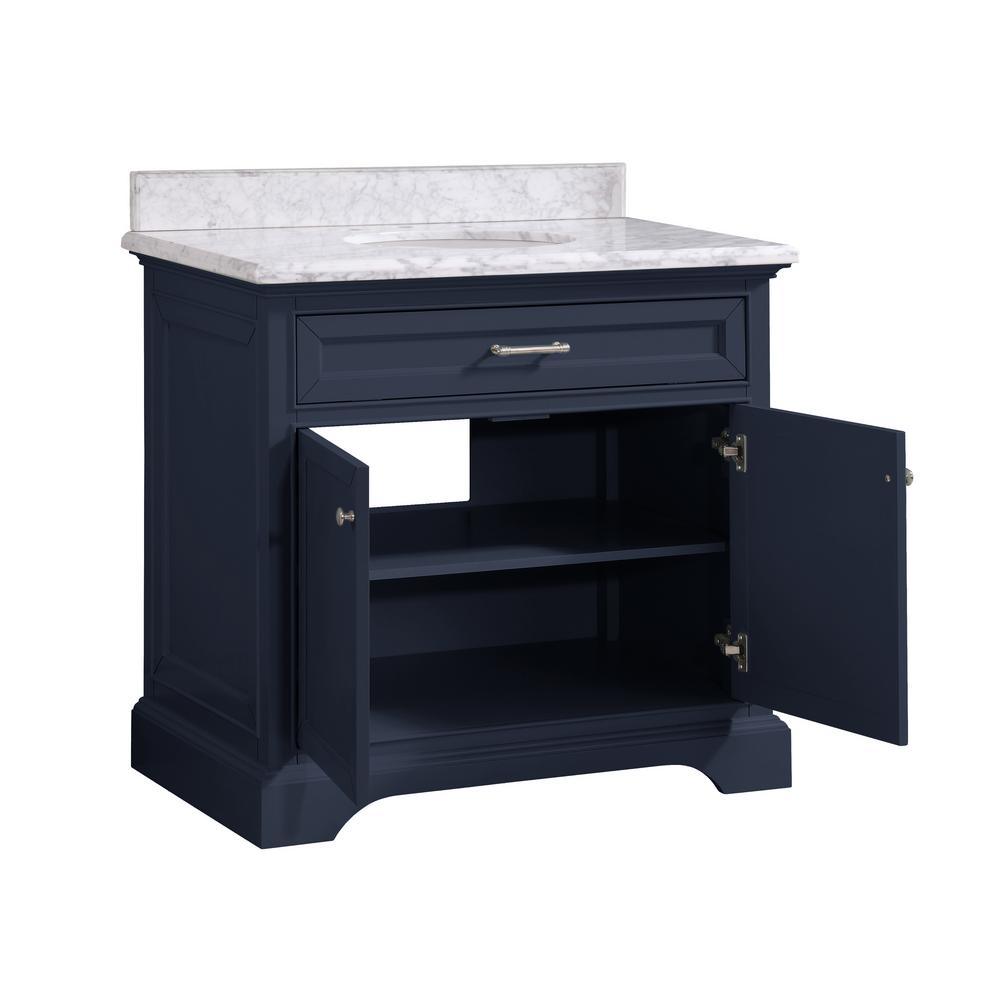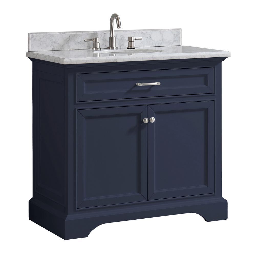 The Windlowe Collection features classical design enhanced by an elegant Navy Blue finish, creating an aesthetic that mixes flair and function. The Windlowe 37 in. vanity showcases its quality and style with a solid wood frame, brushed nickel hardware and soft-close hinges and glides. The vanity combo includes a Carrara white marble top and white vitreous China undermount oval sink.