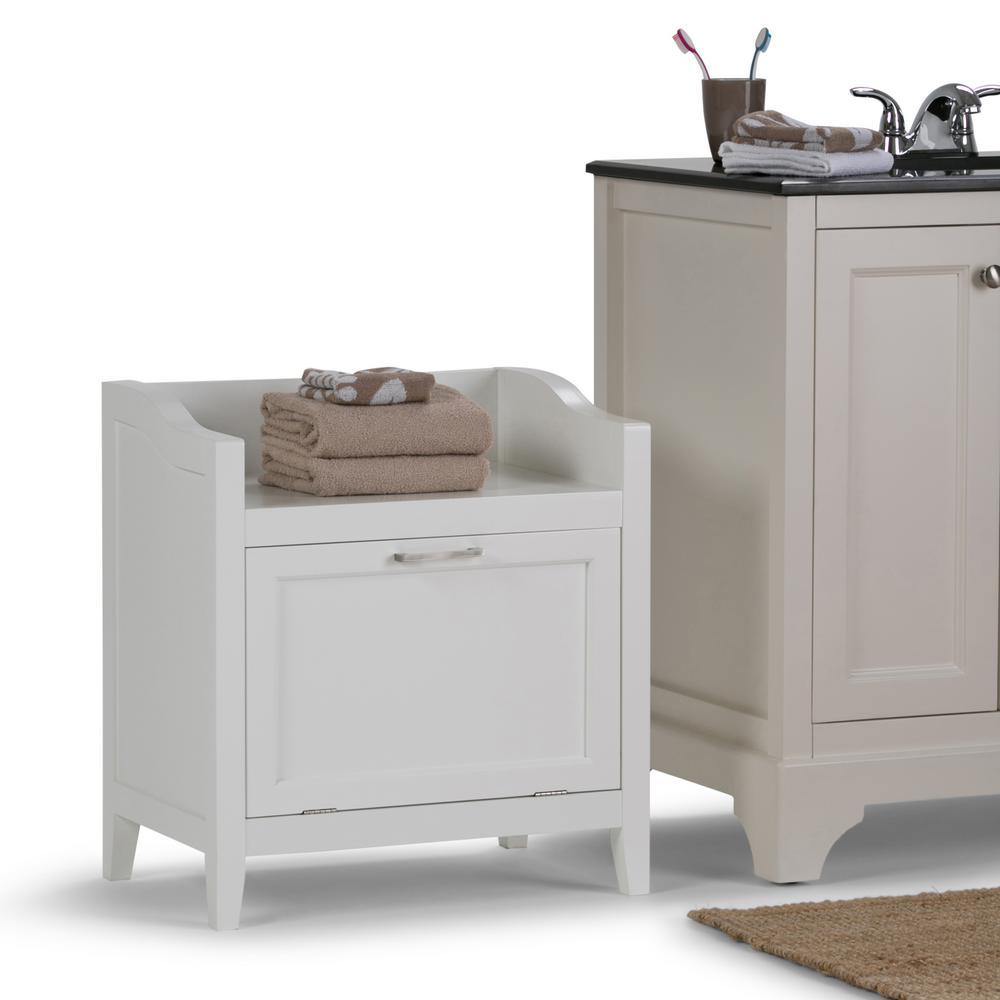 If you need a little spot to sit while drying or dressing, try this handy storage bench. The top can be used to stack extra towels and bath items. While the hamper style cabinet is an ideal storage space for paper supplies and more.