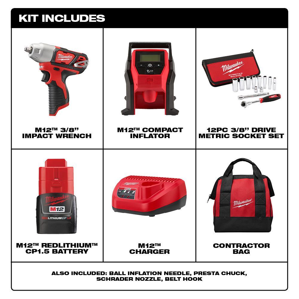 - Includes: one (2463-20) M12 3/8 IMP WRENCH, (2475-20) M12 inflator/air compressor, (48-22-9001) tradesman ratchet set - metric, (48-11-2401) M12 CP1.5 battery, (48-59-2401) M12 charger, contractor bag, ball inflation needle, resta chuck, schrader nozzl, belt hook