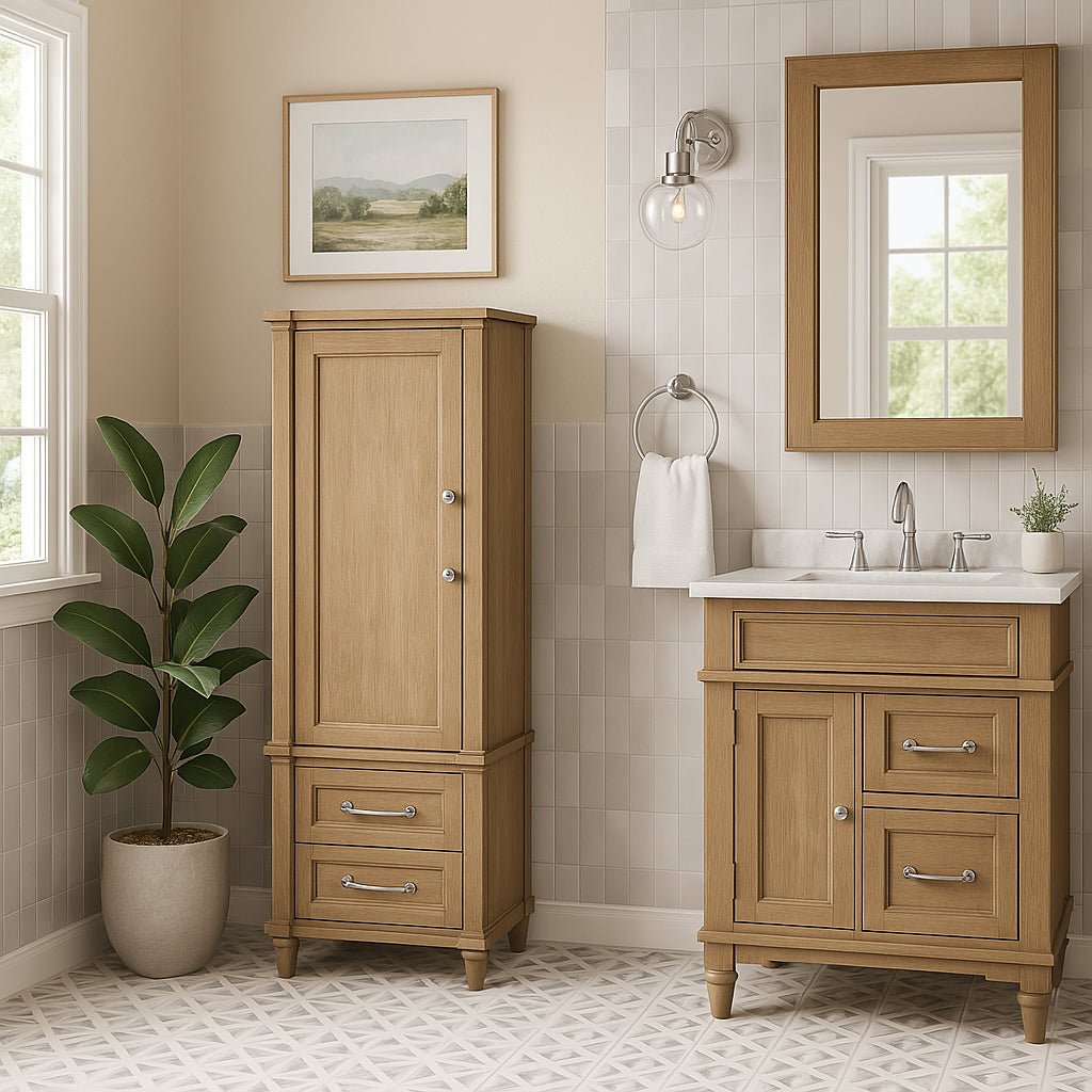 The Aberdeen Linen Cabinet by Home Decorators Collection combines timeless design with practical storage solutions. Featuring an antique oak finish, brushed nickel hardware, and soft-close mechanisms, this freestanding cabinet is perfect for organizing your bathroom essentials.