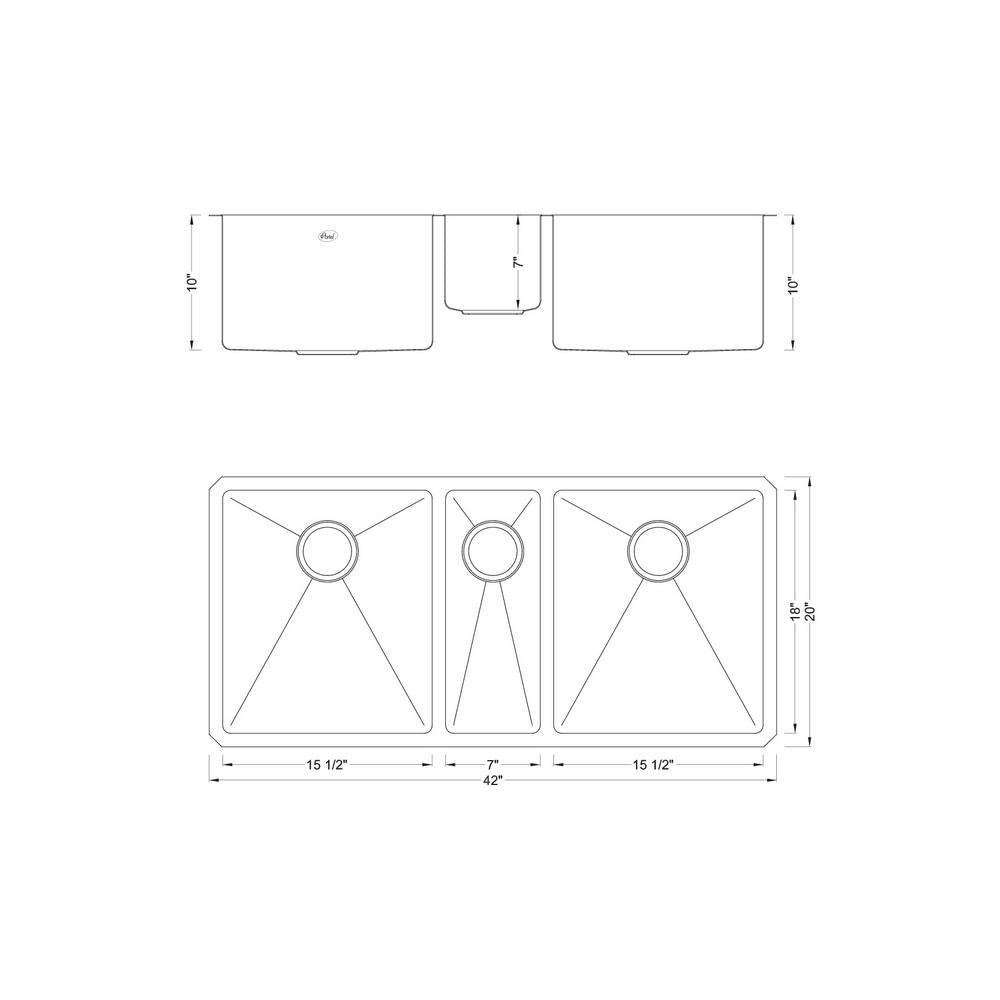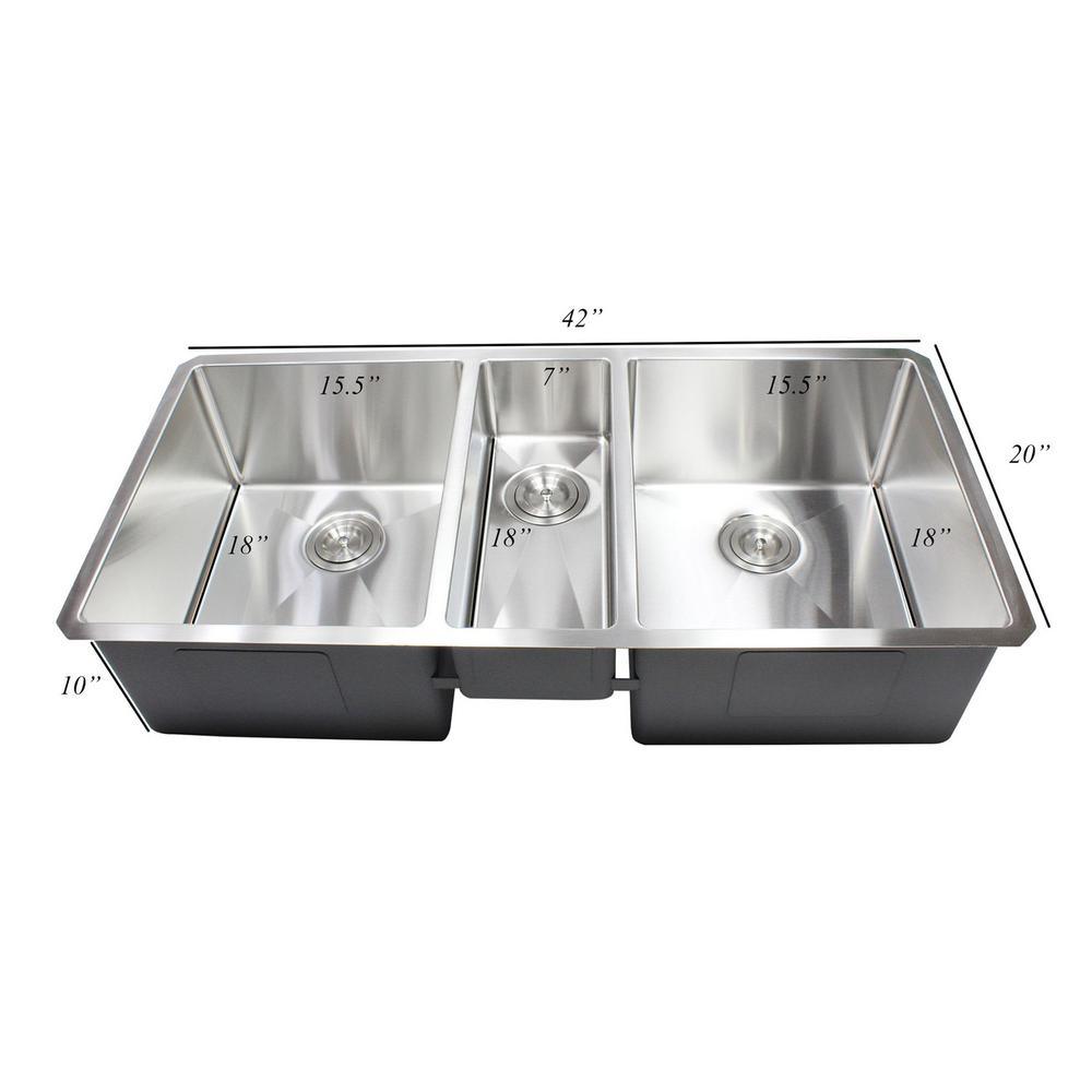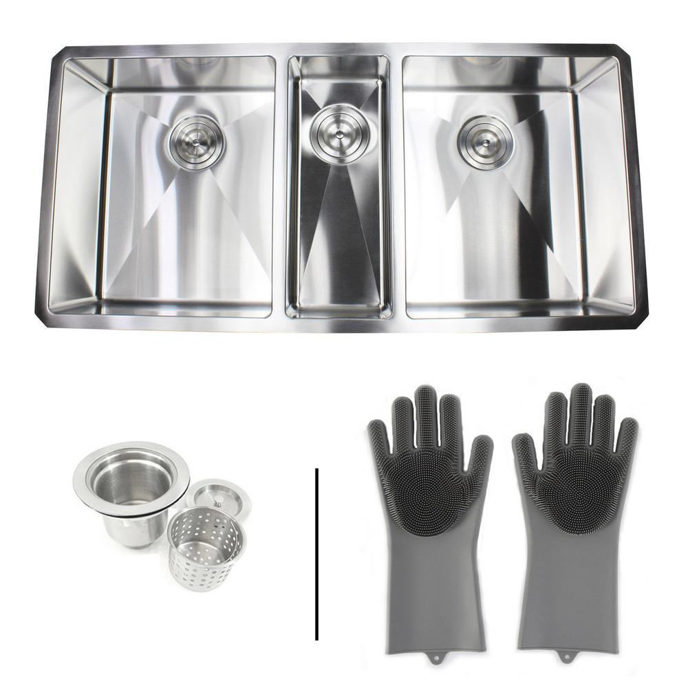 Are you and your family looking for a sturdy kitchen sink that functions perfectly for any type of occasion. Do you have trouble finding a kitchen sink package that includes complementary accessories to ease your kitchen duties. Look no further as we introduce the Premium 16-Gauge Stainless Steel Undermount Triple Bowl Kitchen Sink Combo. The Undermount Kitchen Sink is coated with a brushed stainless steel to provide a contemporary design. This amazing combo package includes 1 pair of silicone gloves and 3 deluxe strainers with lift-out basket. With 15 mm Radius Corners around the sink, it creates a larger bowl area and cleaning of the sink becomes effortless. Our sinks’ noise reduction sound pads block out loud noises and vibration when using of the kitchen sink. The Undermount Sink is covered by the Limited Lifetime Manufacturer Warranty. It has a 3.5 in. drain opening that is compatible with standard garbage disposals. Mounting hardware, installation brackets and cutout template are included. This Undermount Triple Bowl Kitchen Sink Combo is a must-buy for anyone looking to upgrade their kitchen décor with matching accessories to assist on kitchen tasks. The dimensions are as follow: Exterior Size: 42 in. x 20 in. x 10 in./Left Bowl: 15.5 in. x 18 in. x 10 in. D/Middle Bowl: 7 in. x 18 in. x 7 in. D/Right Bowl: 15.5 in. x 18 in. x 10 in. D.