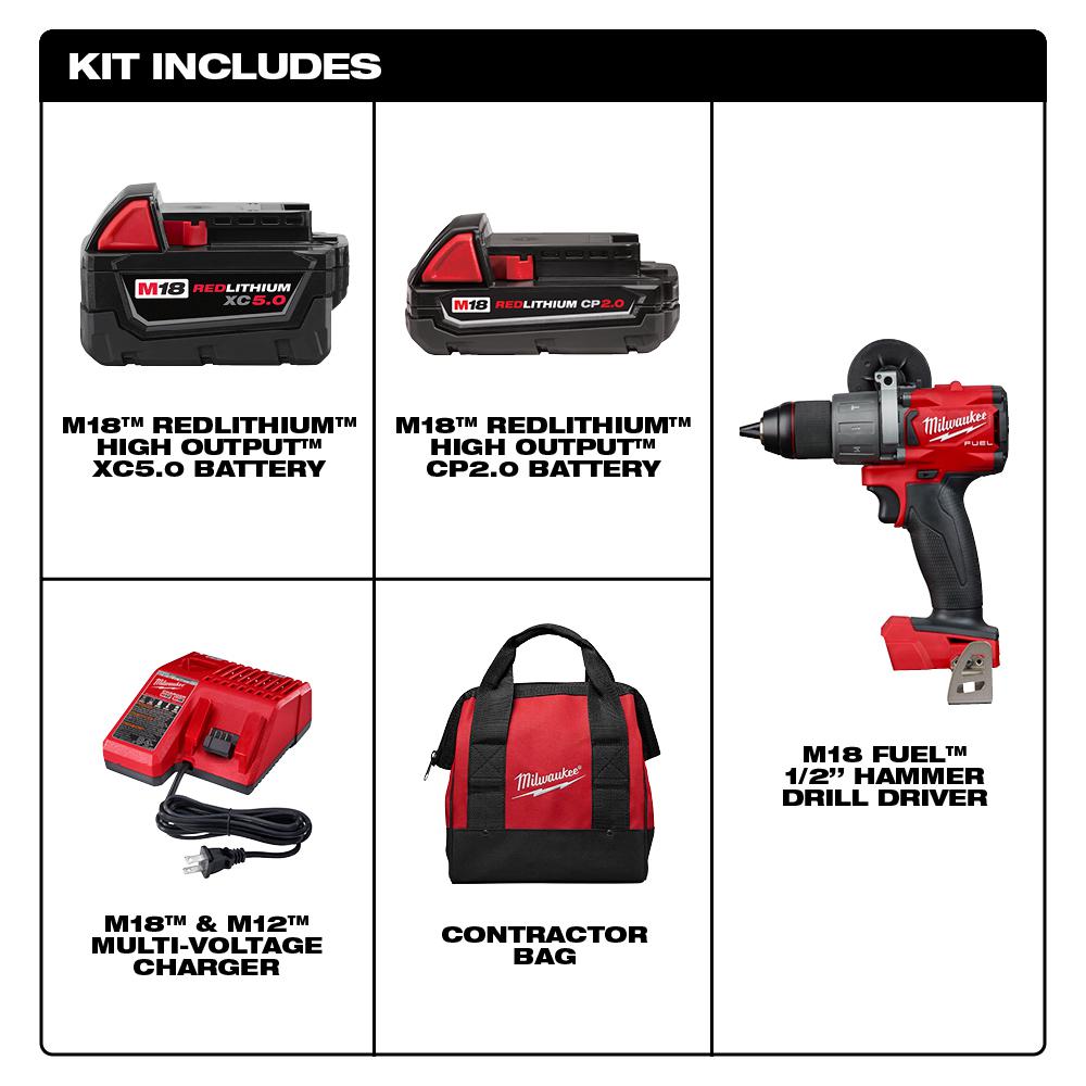 Includes: 1 M18 FUEL 1/2 in. hammer drill (2804-20), 1 side handle, 1 belt clip, 1 bit holder, 1 M18 and M12 standard charger, 1 M18 XC5.0 battery, 1 M18 CP2.0 battery and contractor bag