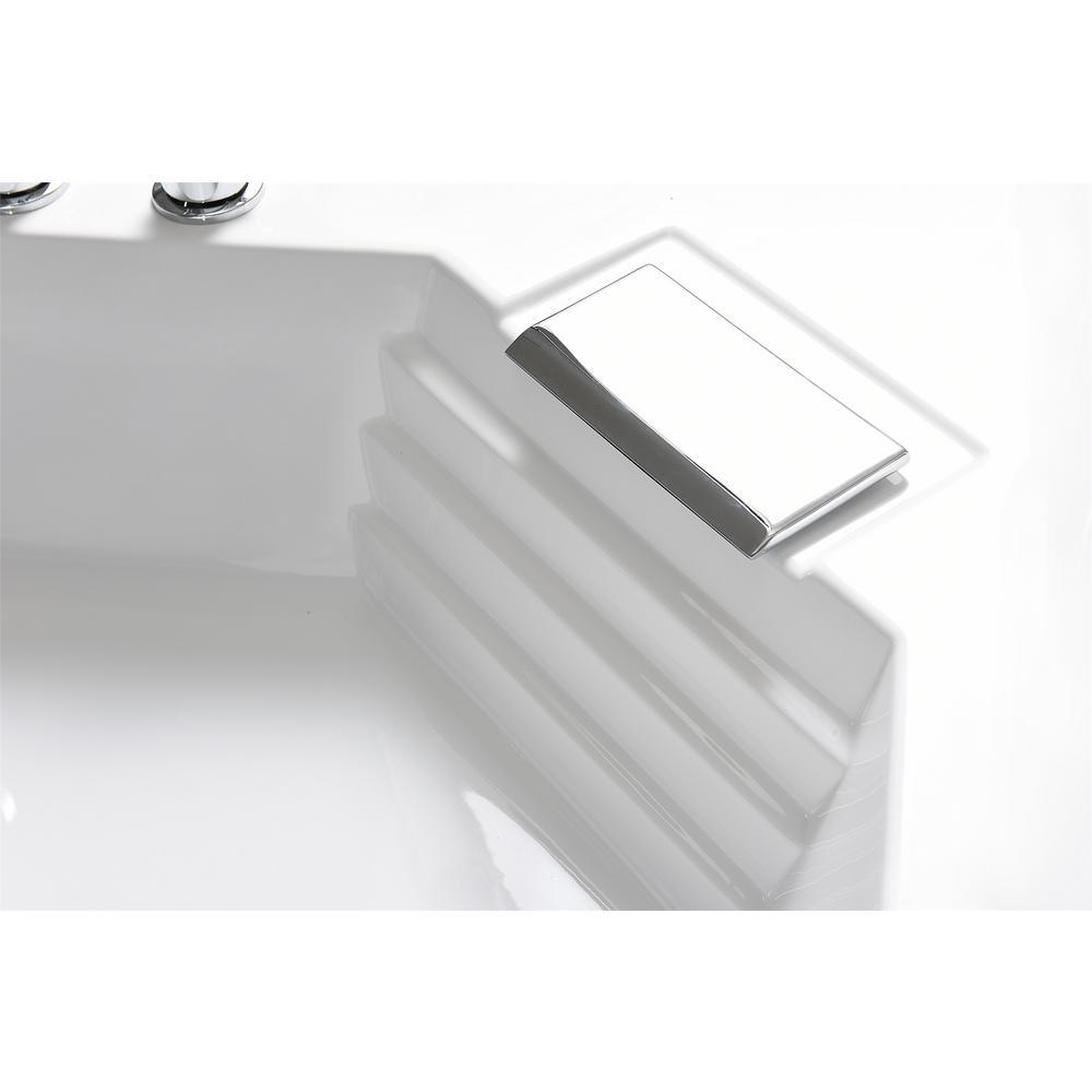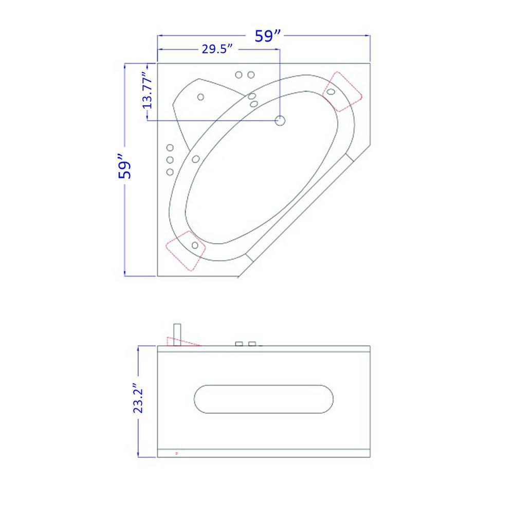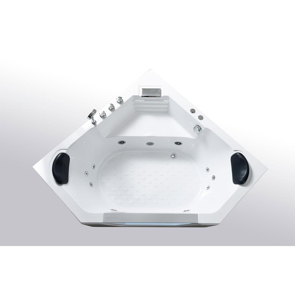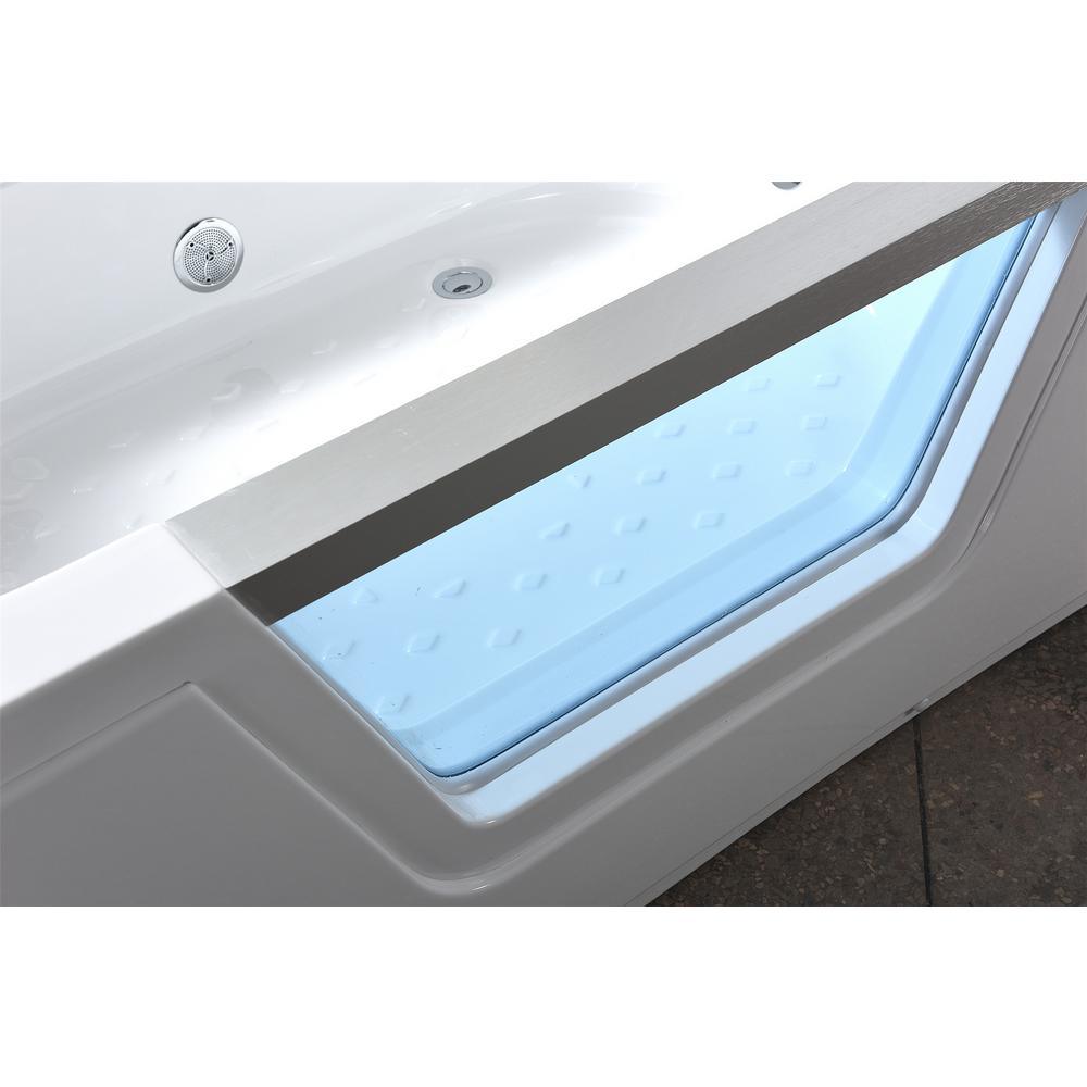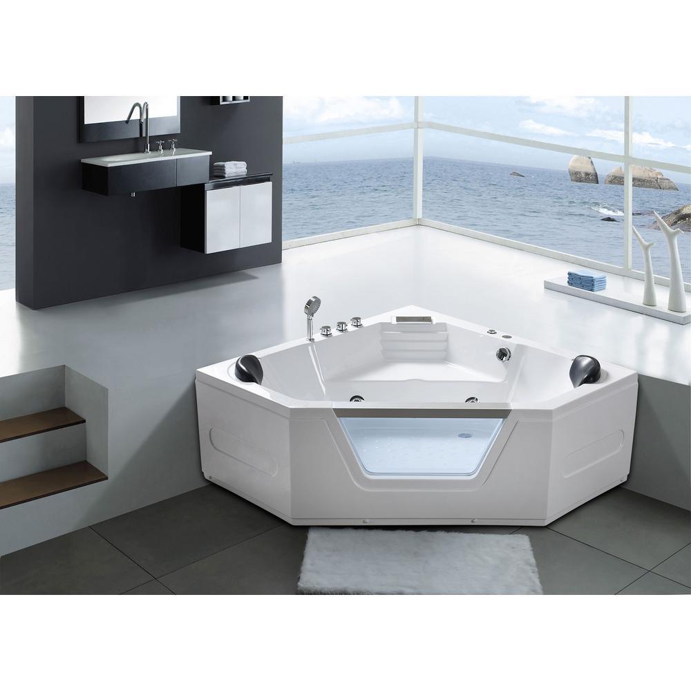 Whirlpool bathtub 59 in. x 59 in. hot tub 10 water jets - Marbella 2 persons bath tub with 1-pannel glass. Technical specifications: Whirlpool bathtub size: 59 in. x 59 in. x 23.2 in. H 1.50HP water pump with 10 nozzles 2 Headrests 4 Chrome-plated big nozzles 6 Chrome-plated little nozzles Electric leakage protection system (automatic circuit breaker) American waterfall included 1 Multifunctional shower 1 Switch Water circulation Taps included White high quality sanitary acrylic bath tub Weight: 220 lbs. Steel frame 1-pannel glass.