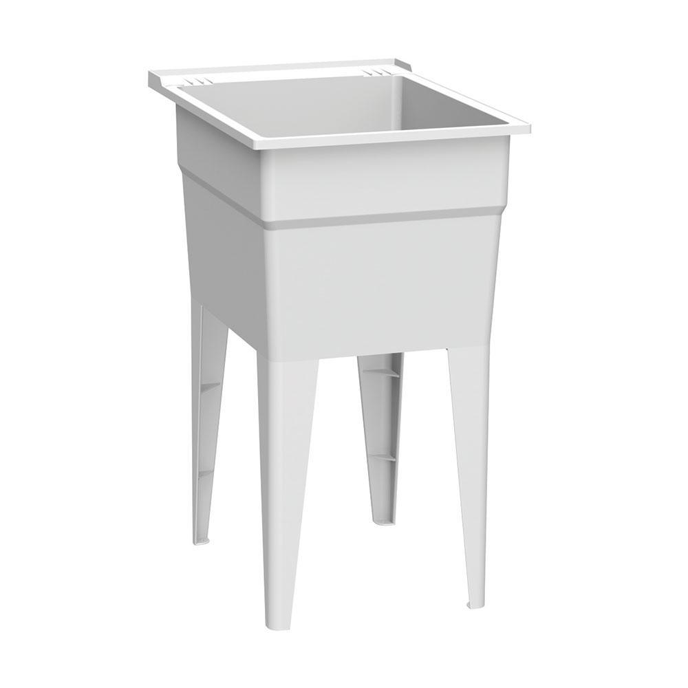 Narrow 18 in. white laundry tub with two integrated soap dishes and four legs designed to support two shelves. 100% Virgin Polypropylene Materials. Non rust adjustable feet/legs.