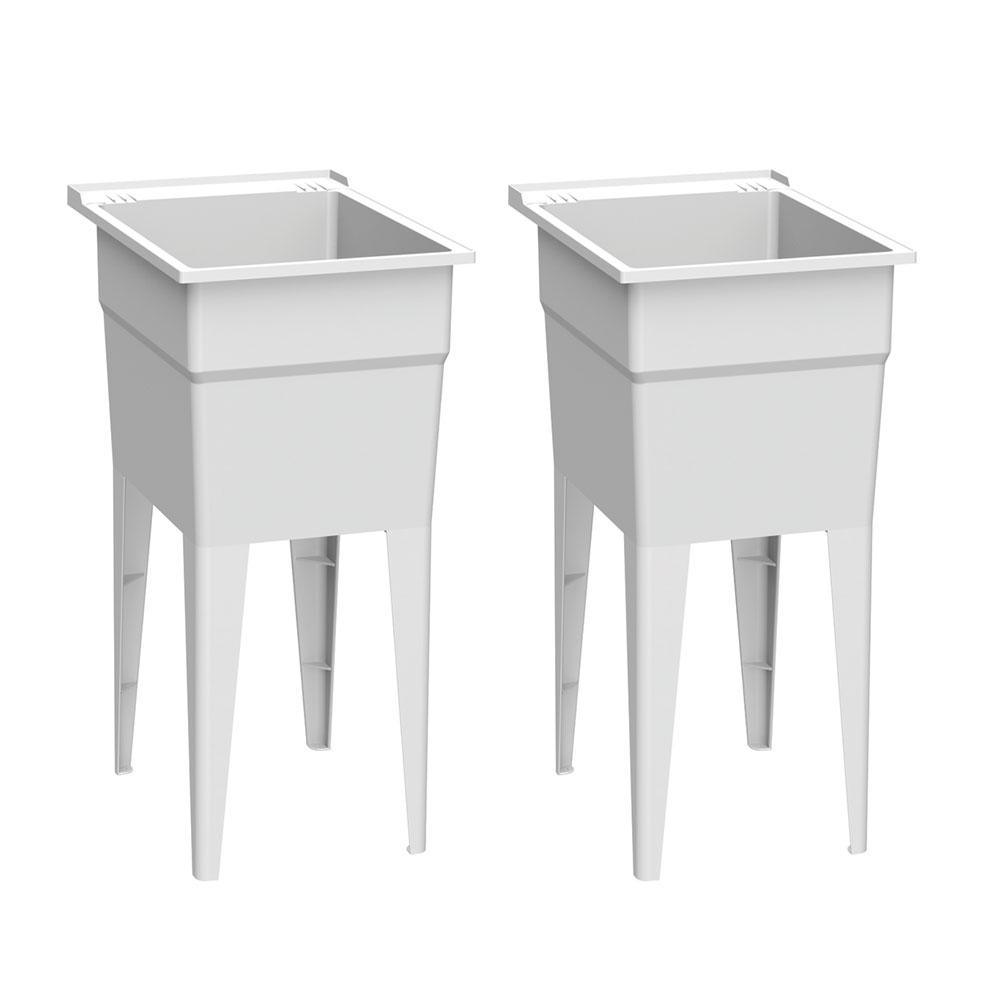Narrow 18 in. white laundry tub with two integrated soap dishes and four legs designed to support two shelves. 100% Virgin Polypropylene Materials. Includes Non-rust adjustable feet/legs.