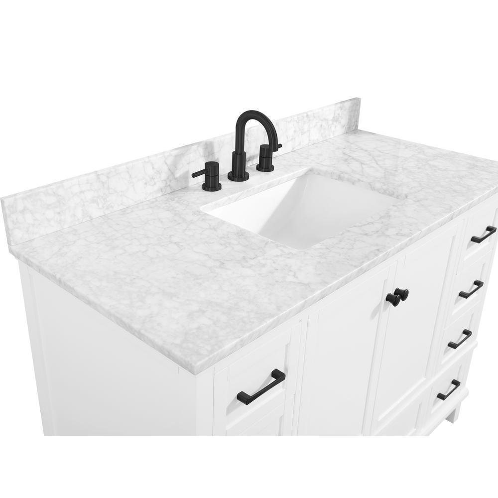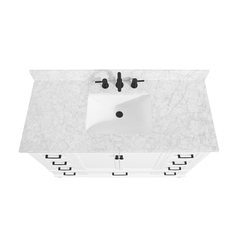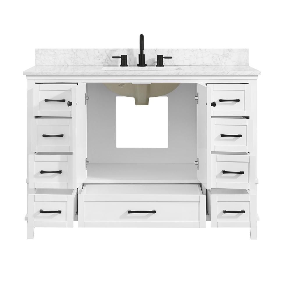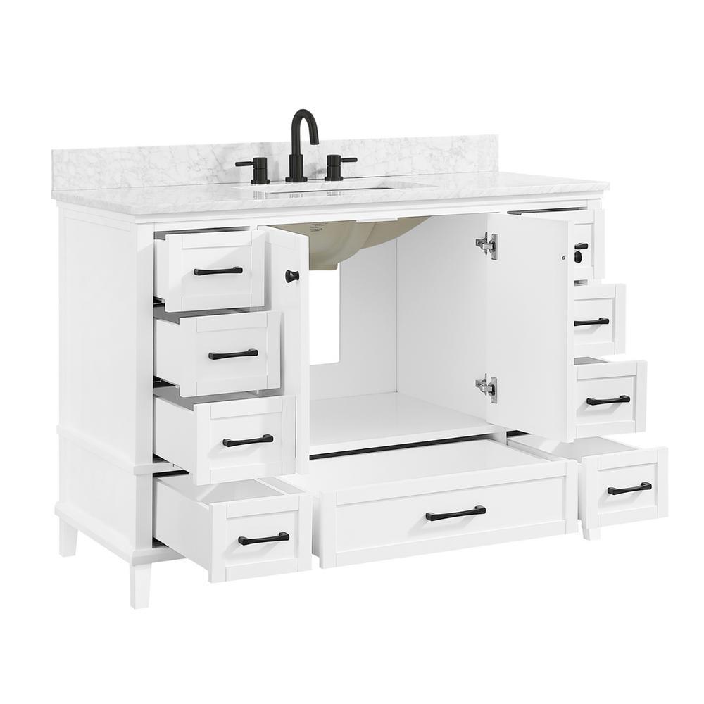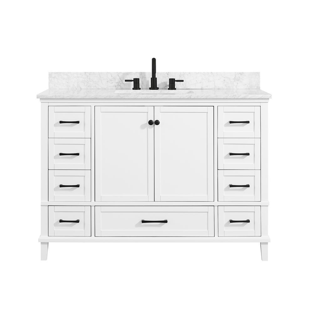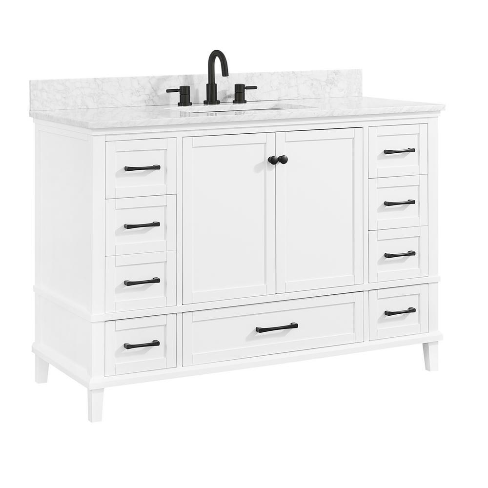 Restore beauty to your bathroom with the Merryfield 49 in. Bath Vanity in White. A pristine Carrara white marble top and rectangular undermount sink top off the handsome cabinet, which features simple lines and subtle styling. Black finish hardware, solid wood frame, soft-close glides and hinges, and adjustable shelf speak to superior construction. Combine it with the matching mirror or mirror cabinet and linen tower to create an elegant ensemble.