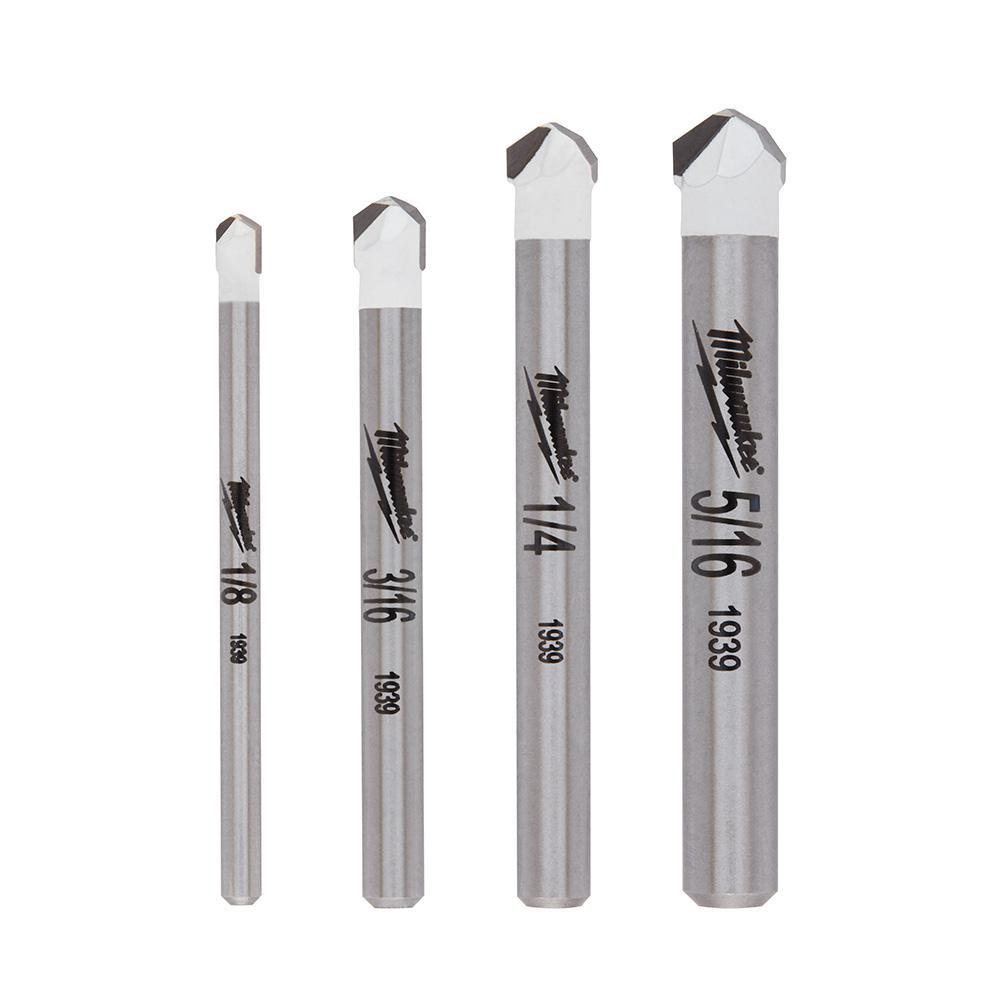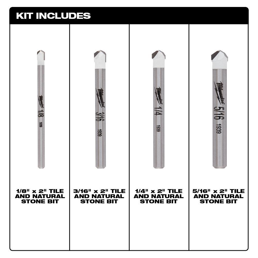 The Milwaukee 4-Piece Tile and Natural Stone Drill Bit Set delivers up to 2X life in granite, stone, ceramic tile and glass. These bits are designed for use in hammer mode, providing faster drilling speeds when drilling into natural stone tiles, like granite and marble. Equipped with an aggressive 8-grind carbide head, these bits deliver up to 20% faster drilling. The bit's reinforced tip protects the carbide head, providing the durability needed for use in hammer drill mode. Milwaukee Tile and Natural Stone Bits can be used in drill-only mode or hammer drill-mode and are not recommended for porcelain tile. This kit includes one 1/8 in., one 3/16 in., one 1/4 in. and one 5/16 in. drill bit for natural stone.