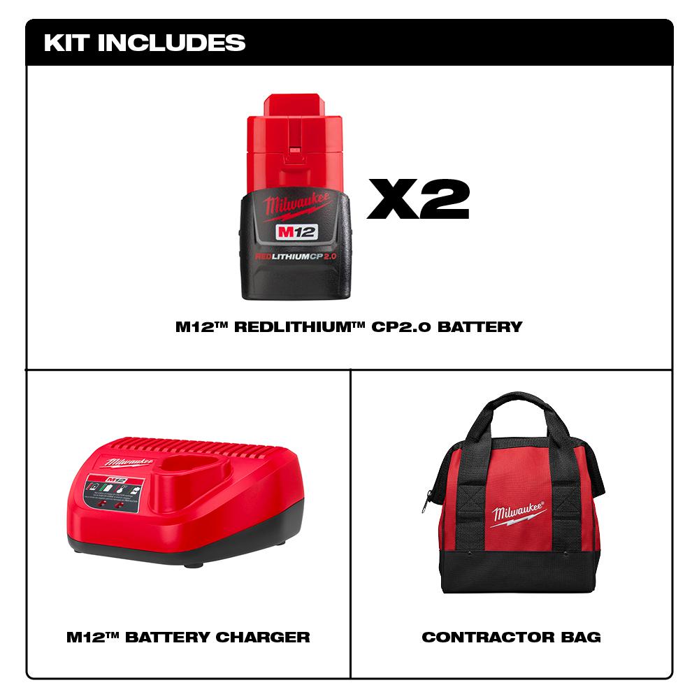 - (2) M12 2.0AH Battery (48-11-2420); (1) M12 Charger (48-59-2401); contractor bag