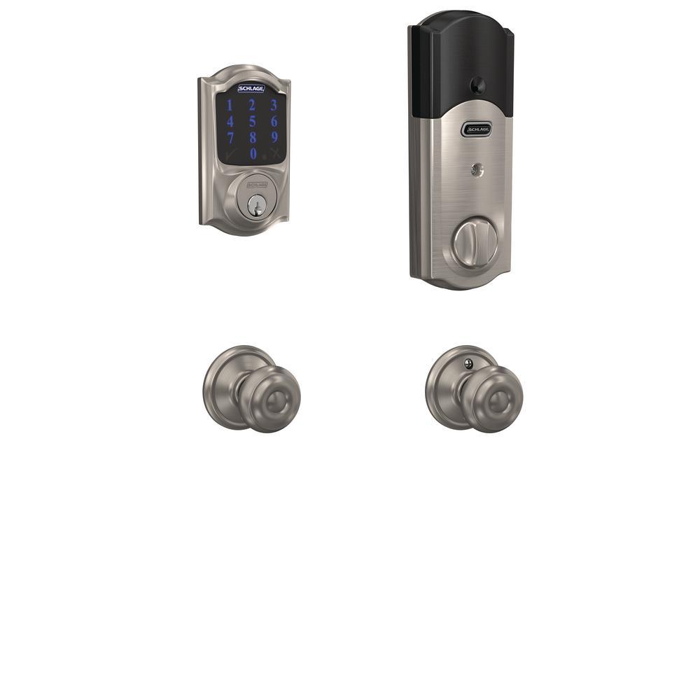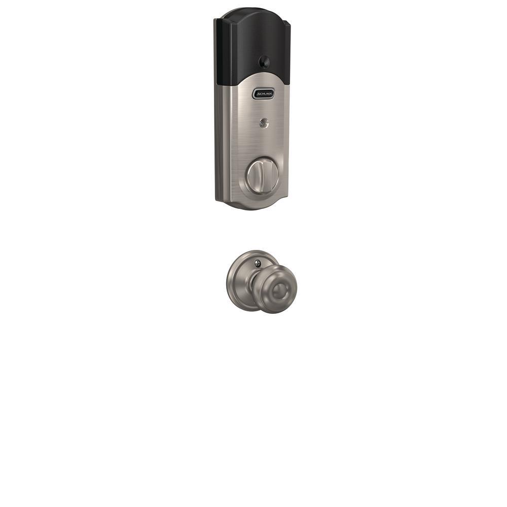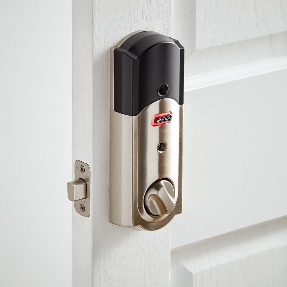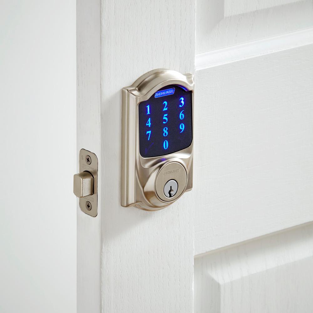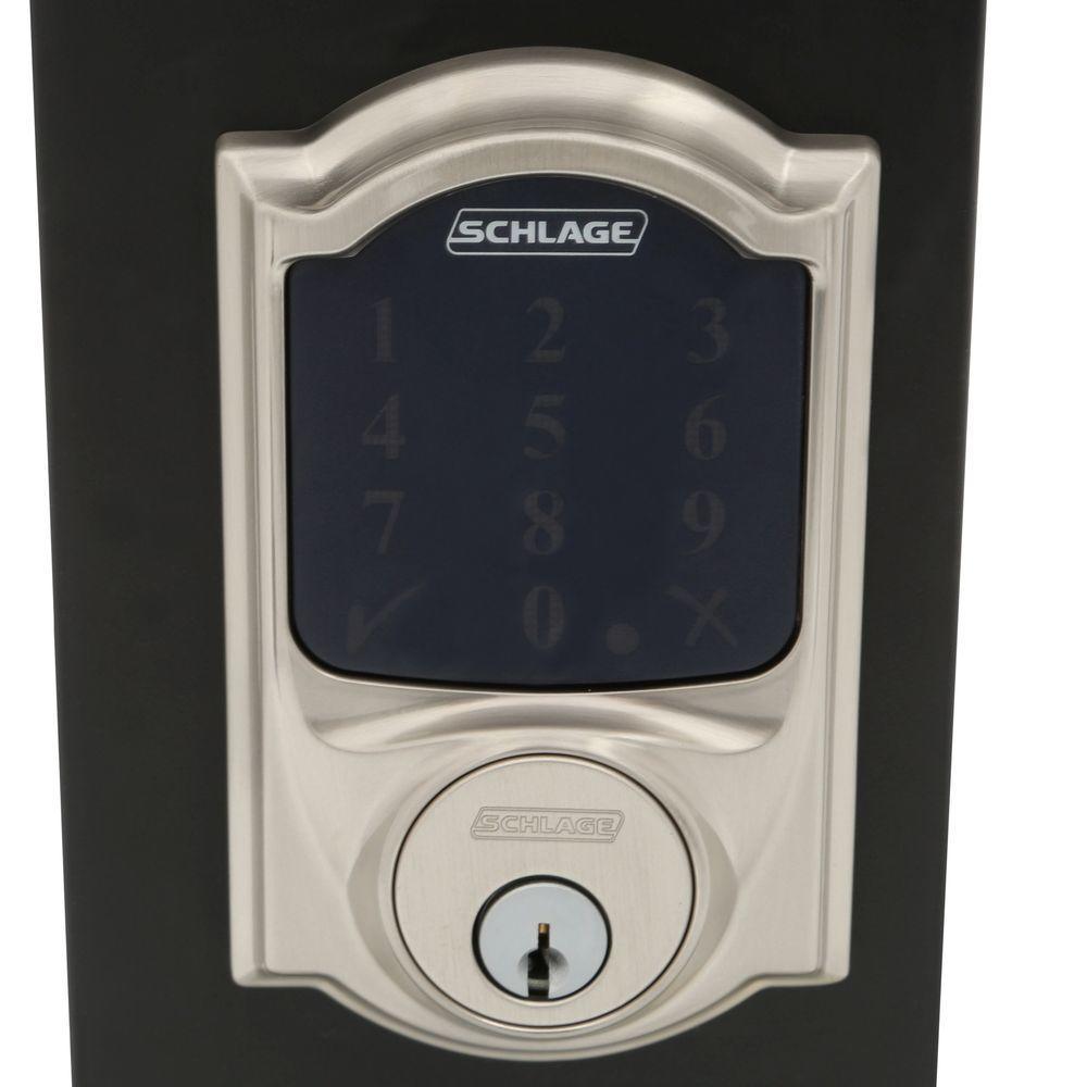Strong has a name. It s who we are, it s what we do. And for more than 90-years, Schlage has brought uncommon strength to everything we design, build and test to keep you safe, sound and secure. With the Camelot Satin Nickel Connect Smart Lock with Alarm and Passage Geo Knob, we have created a door lock that combines all of our best security features into 1 lock. And you have the convenience of going keyless and no longer having keys to lose, hide, carry or forget. Connect the Schlage Touchscreen Deadbolt to your home automation or security system to stay in sync with your home. Control access with your smartphone to lock or unlock from anywhere and receive an alert when specific codes are entered at the lock. Remote access requires a compatible home automation or security system. Features dependent on platform provider. The Schlage Touchscreen Deadbolt connects with Z-Wave.