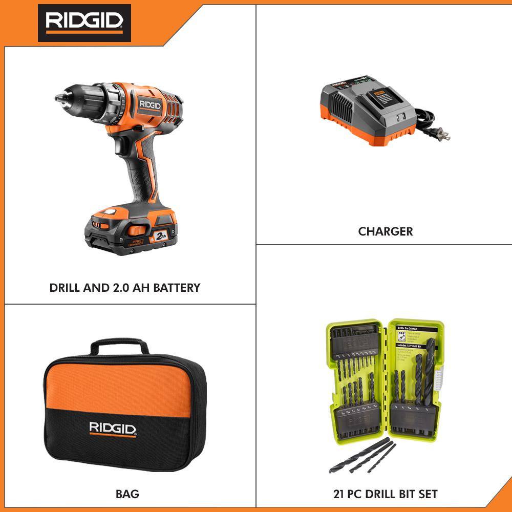 RIDGID introduces the 18-Volt Cordless 2-Speed 1/2 in. Compact Drill/Driver Kit and Black Oxide Drill Bit Set (21-Piece). This 18-Volt 2-Speed Drill/Driver Kit features all metal gears for added durability on the jobsite or at home. The 1/2 in. single sleeve ratcheting chuck holds bits tight and secure. This kit is backed by the Industry's Only Lifetime Service Agreement, simply register within 90 days of purchase for FREE Parts. FREE Service. For LIFE. The RIDGID Drill/Driver kit includes a 2 Ah Lithium-Ion Batteries, an 18-Volt Charger, a tool bag, a double-ended bit, and an operator's manual. The RYOBI 21-Piece Black Oxide Drill Bit Set is a great kit for a wide variety of drilling applications. Identify this kit quickly among your tools with the easy-to-read description on the side of the case. These bits are constructed out of high speed steel and feature a black oxide finish for maximum durability, and include sizes from 1/16 in. to 1/2 in. to meet the most common drilling needs.