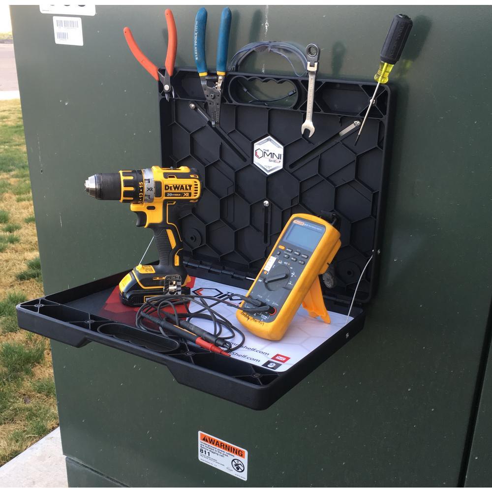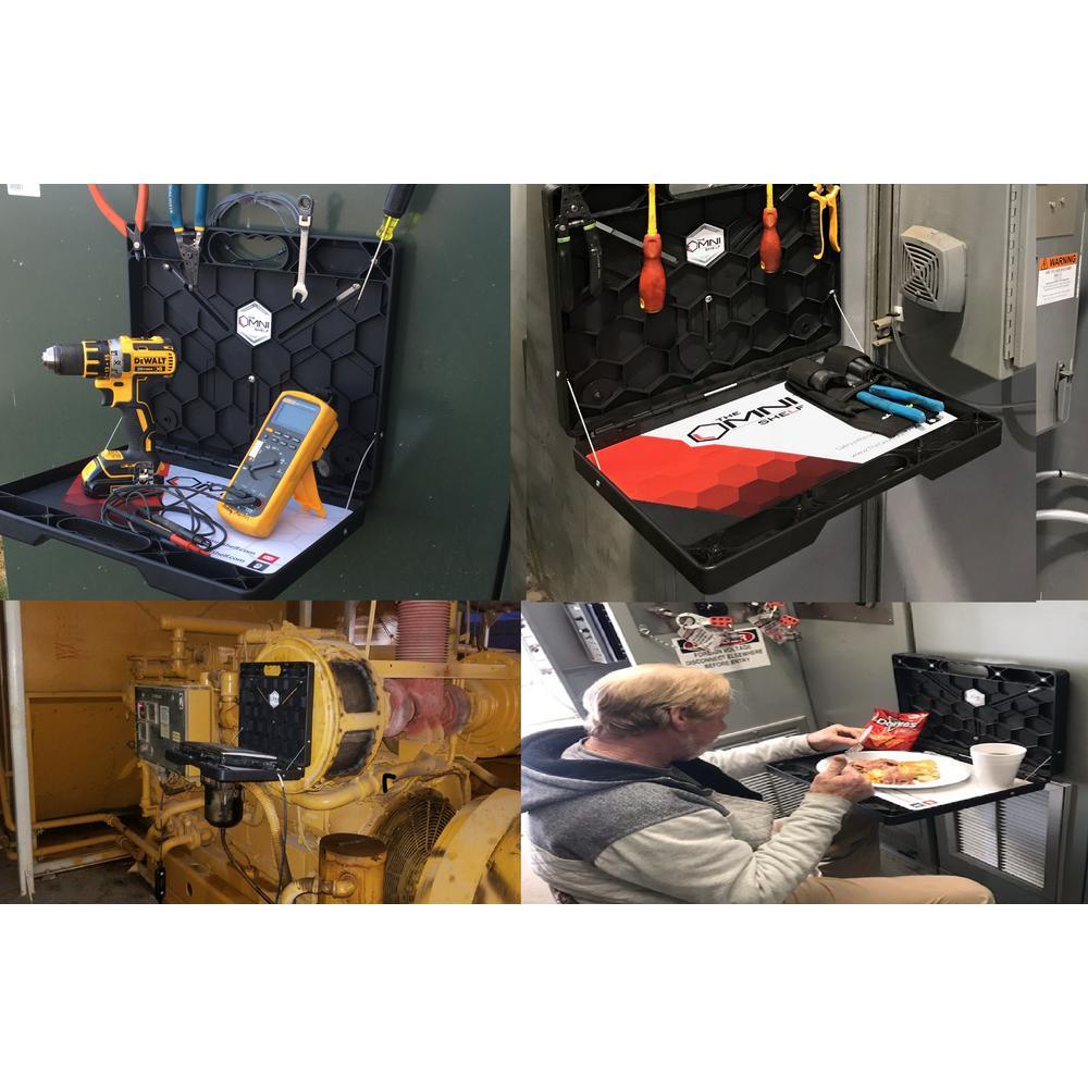 - OmniShelf –the world’s first portable magnetic workstation plus doubles as a briefcase – attaches to almost any surface with 3 industrial strength magnets – telephone poles, sides of trucks, factory walls, HVAC machinery, etc keeps hands free to work on the job site