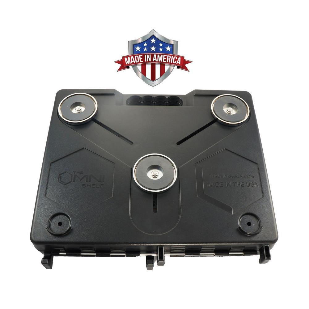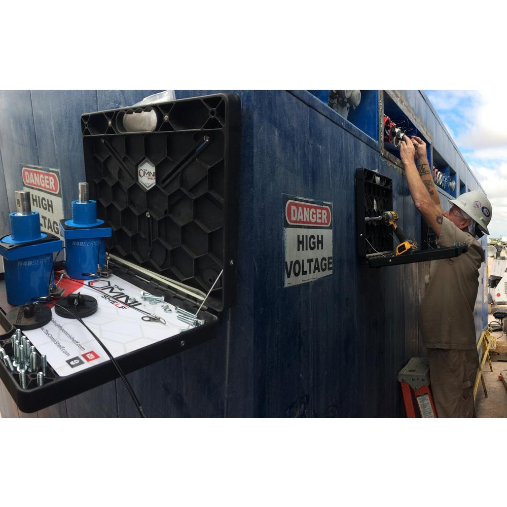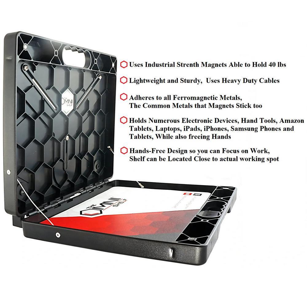 The OmniShelf Magnetic portable workstation is a newly created invention that doubles as a briefcase and allows you to have your hands free to do your work while you are on the go. This unique 2-in-1 magnetic utility shelf attaches to almost any surface with 3 industrial strength magnets. Attach it to metal doors and walls with metal studs. It also works on stainless steel, aluminum and most other metals, poles, vehicles, walls, and a wide variety of machinery The OmniShelf is the perfect solution for numerous occupations including business professionals, utility lineman, oil field workers, HVAC technicians, electricians. People that work in transportation, hospitality, leisure, or foreign service, our workstation is for you. If you work as a consultant, event planner, pilot, tour guide, photographer, entertainer, truck driver, the OmniShelf is for you. The OmniShelf is made from virtually indestructible plastic. It is lightweight, yet incredibly sturdy and durable. The D design of our patented shelf supports most laptops, tablets, notebooks, calculators, pens, trade tools and other accessories. The OmnihSelf has a slot that holds important paperwork and comes with a large mousepad.