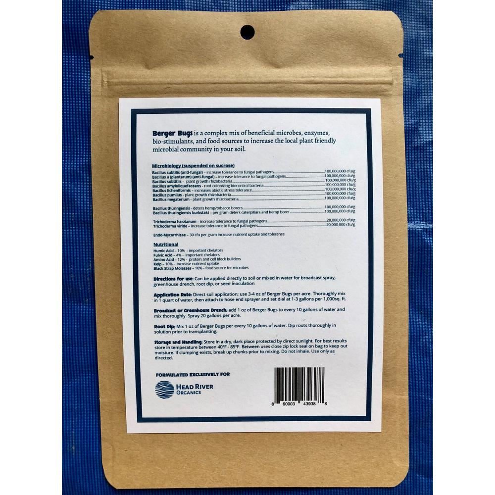 Berger Bugs is a complex mix of beneficial microbes, enzymes, bio-stimulants, and food sources to increase the local plant friendly microbial community in your garden. Microbiology(suspended on sucrose): 7 Bacillus strains - 100,000,000 cfu/gm/each total 700,000,000 2 BT strains - 100,000,000 cfu/gm/each total 200,000,000 2 Trichoderma strains-20,000,000 cfu/gm/each total 40,000,000 Endo-Mycorrhizae - 30 cfu/gm Nutritional: Humic Acid - 10% Fulvic Acid - 4% Amino Acid - 12% Kelp - 10% Black Strap Molasses - 10%. Can be applied directly to soil or mixed in water for broadcast spray, greenhouse drench, root dip, or seed inoculation. Application Rate: Direct soil application-use 3 oz. to 4 oz. of Berger Bugs per acre. Thoroughly mix in 1 qt. of water, then attach to hose end sprayer and set dial at 1 Gal. per 1,000 sq. ft. Broadcast or Greenhouse Drench-add 1 oz of Berger Bugs to every 10 Gal. of water and mix thoroughly. Spray 20 Gal. per acre. Root Dip-Mix 1 oz of Berger Bugs per every 10 Gal. of water. Dip roots thoroughly in solution prior to transplanting.