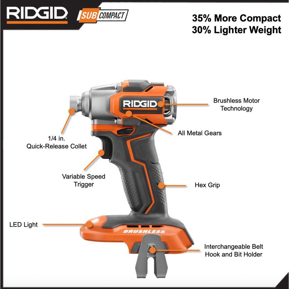 Impact Driver: SubCompact model is 30% less weight and 35% more compact in comparison to RIDGID OCTANE Brushless Impact Driver R86039B