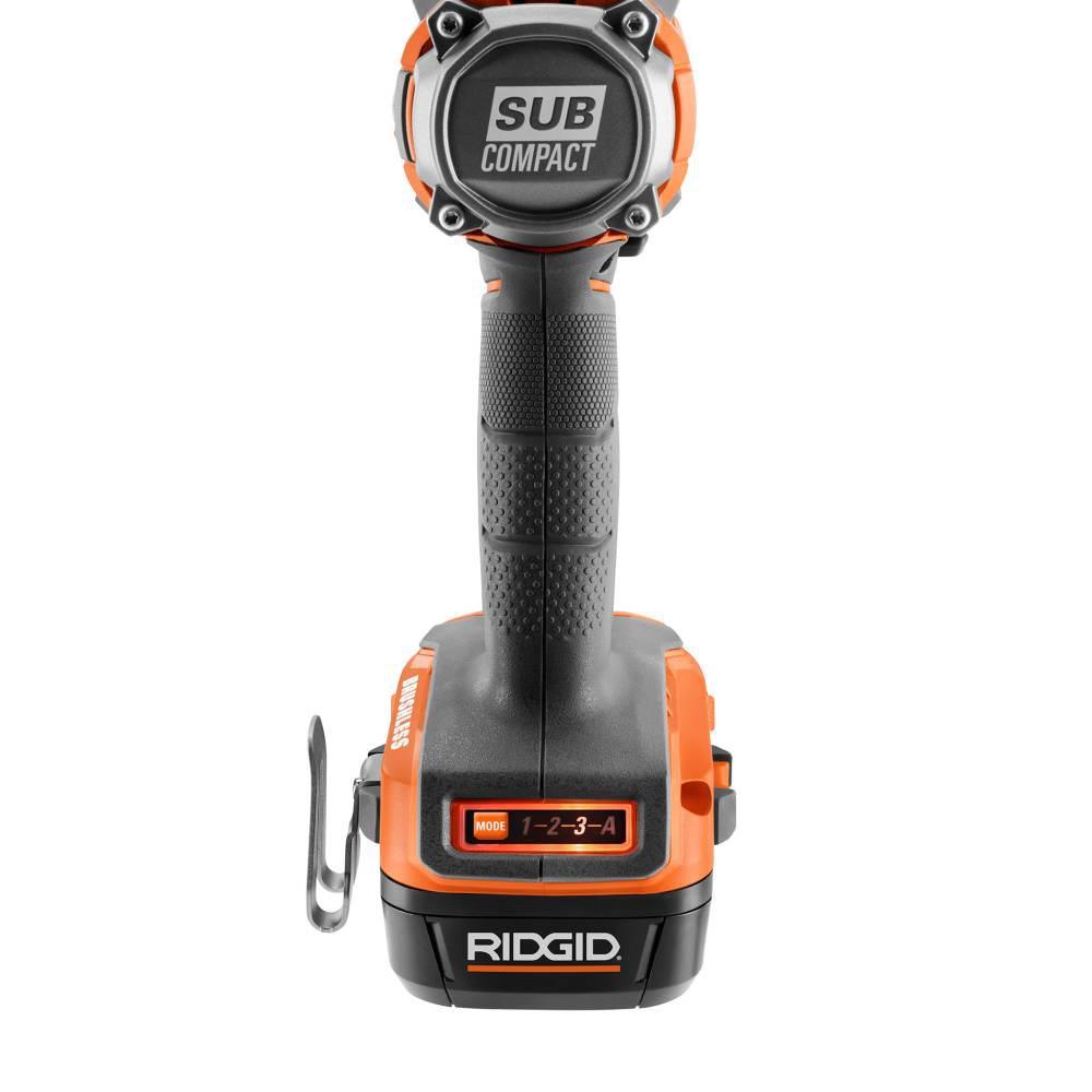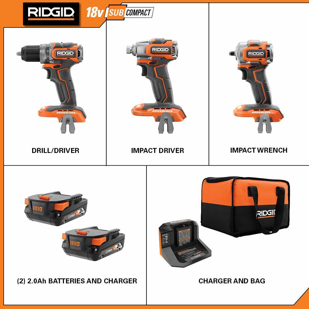 RIDGID introduces the 18-Volt SubCompact Lithium-Ion Brushless Cordless 2-Tool Combo Kit with 2-Speed 1/2 in. Drill/Driver, Impact Driver, and 3/8 in. Impact Wrench with (2) 2.0 Ah Batteries, Charger, and Bag. RIDGID SubCompact Brushless tools offer optimized ergonomics and power in a lightweight form. This combo kit is 30% less weight and up to 35% more compact to reduce fatigue and allow you to complete the job at hand. The Brushless Motors offer more runtime and longer motor life. The SubCompact Brushless 2-Speed 1/2 in. Drill/Driver features all metal gears for extended jobsite durability. The SubCompact Brushless Impact Driver features high torque output of 1,800 in./lbs. of torque. This 18-Volt SubCompact Brushless 3/8 in. Impact Wrench has 4-modes, including a unique auto-tightening mode, that helps it to stand out from the competition and makes it a must have in any shop. This SubCompact Brushless 3/8 in. Impact Wrench will relieve fatigue with 20% less weight and 25% more compact with its optimized ergonomics. This kit is backed by the Industry's Only Lifetime Service Agreement, simply register within 90 days of purchase for FREE Parts, FREE Service, For LIFE. The RIDGID 18-Volt SubCompact Cordless Brushless Kit includes the 2-Speed 1/2 in. Drill/Driver, Impact Driver, 3/8 in. Impact Wrench with belt clip, (2) 18-Volt 2.0 Ah Batteries, an 18-Volt Charger, a tool bag, and an operator's manual.