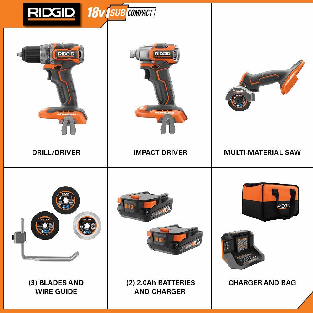 RIDGID introduces the 18-Volt SubCompact Lithium-Ion Brushless Cordless 2-Tool Combo Kit with 2-Speed 1/2 in. Drill/Driver, and Impact Driver, with (2) 2.0 Ah Batteries, Charger, and Bag. RIDGID SubCompact Brushless tools offer optimized ergonomics and power in a lightweight form. This combo kit is 30% less weight and up to 35% more compact to reduce fatigue and allow you to complete the job at hand. The Brushless Motors offer more runtime and longer motor life. The SubCompact Brushless 2-Speed 1/2 in. Drill/Driver features all metal gears for extended jobsite durability. The SubCompact Brushless Impact Driver features high torque output of 1,800 in./lbs. of torque. This 18-Volt SubCompact Brushless Cordless 3 in. Multi-Material Saw delivers multi-material cutting capability in an ergonomic package, optimized for 1-handed use. This kit is backed by the Industry's Only Lifetime Service Agreement, simply register within 90 days of purchase for FREE Parts, FREE Service, For LIFE. The RIDGID 18-Volt SubCompact Cordless Brushless Kit includes the 2-Speed 1/2 in. Drill/Driver, Impact Driver, 3 in. Multi-Material Saw with a metal cut off wheel, a diamond tile wheel, a carbide abrasive wheel, a rotating upper guard, an adjustable wire guide, an LED light, a hex key, (2) 18-Volt 2.0 Ah Batteries, an 18-Volt Charger, a tool bag, and an operator's manual.