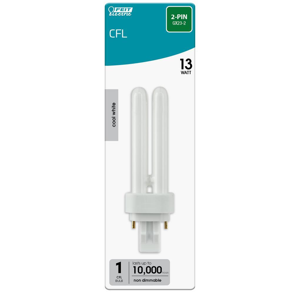 The BPPLD13/41/HDRP Feit Electric 13-Watt GX23-2 Base CFL 4100K cool white light is a PL shape for your general purpose and task lighting needs. It replaces traditional bulbs with an affordable compact fluorescent technology that produces a light output of 800 Lumens, using only 13-Watt of electricity. Feit Electric CFL bulbs have a relatively cool running performance, an average life of 10,000 hours / 9.1 years and are RoHS / FCC compliant. Choose a dependable, general purpose lighting bulb for residential or commercial applications.