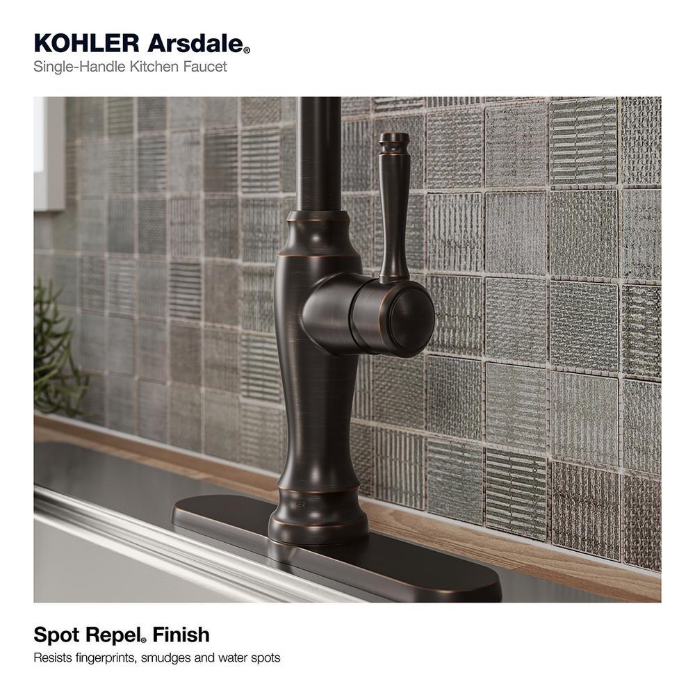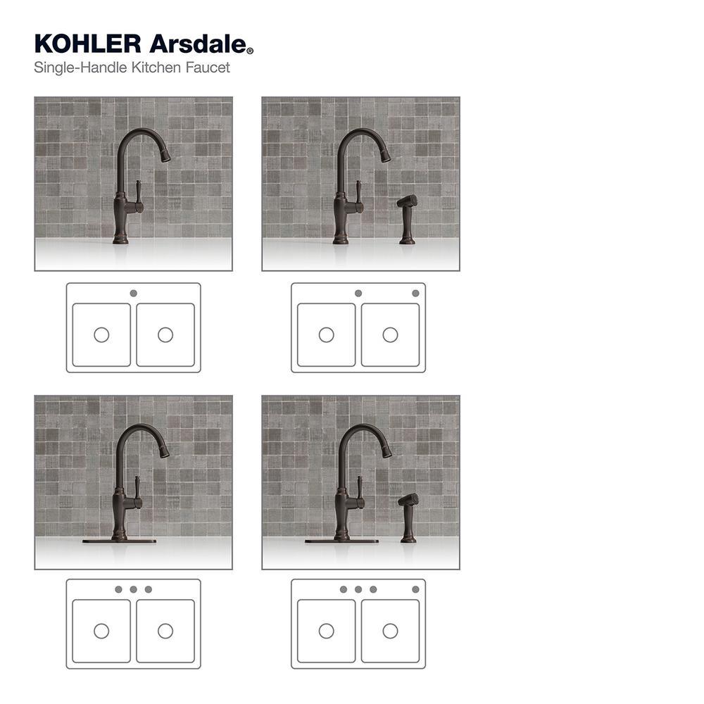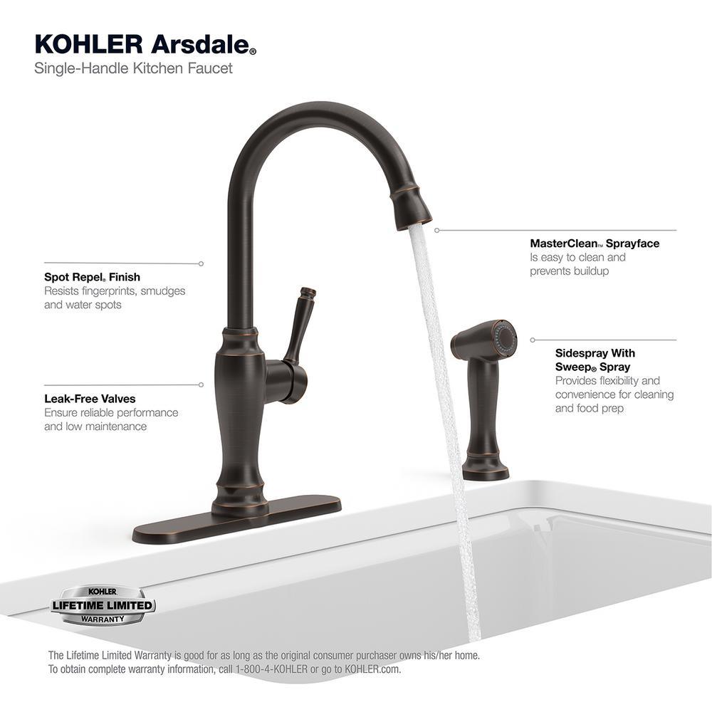 A modern interpretation of a classically styled faucet, the Arsdale single-handle kitchen faucet combines smooth curves and defined edges for an unmistakably unique silhouette. The high-arch swing spout and side spray with Sweep makes everyday tasks enjoyable. It comes with a lifetime limited warranty.