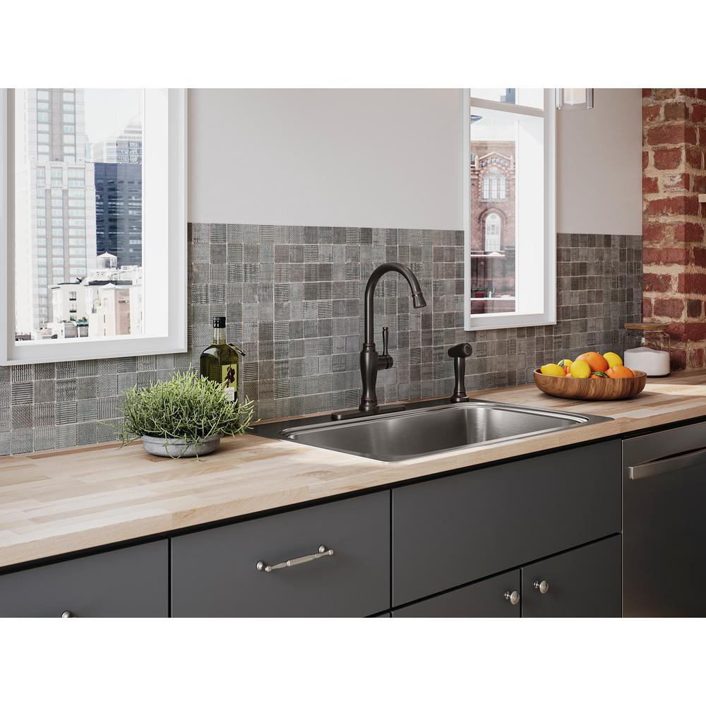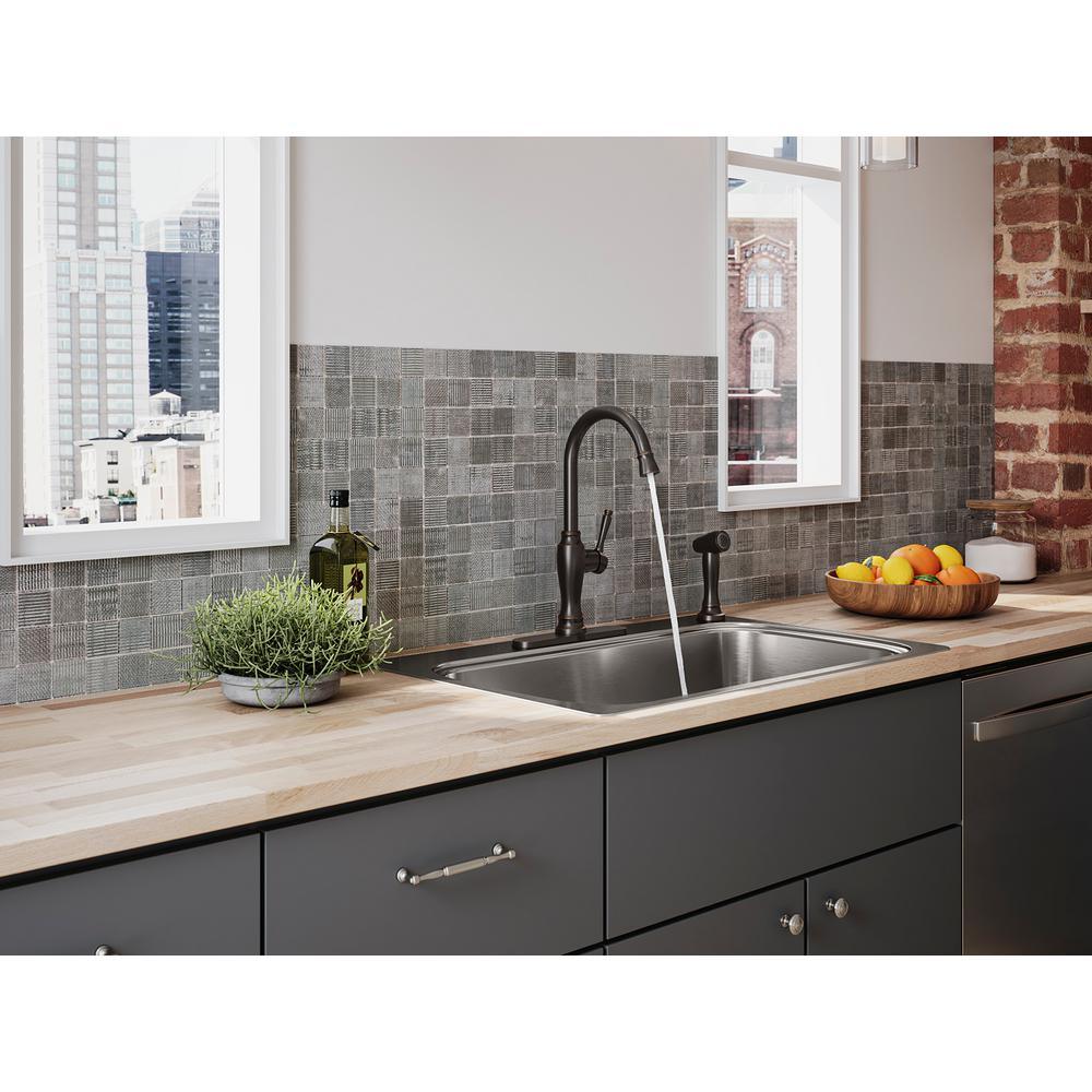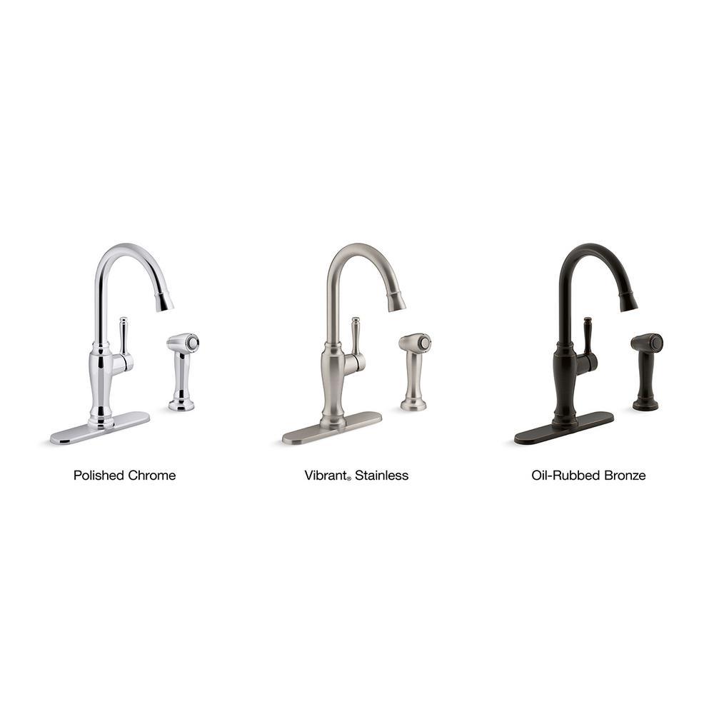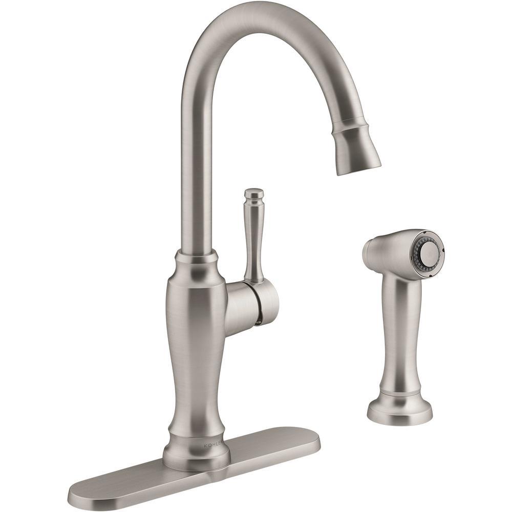 A modern interpretation of a classically styled faucet, the Arsdale single-handle kitchen faucet combines smooth curves and defined edges for an unmistakably unique silhouette. The high-arch swing spout and side spray with Sweep makes everyday tasks enjoyable. It comes with a lifetime limited warranty.
