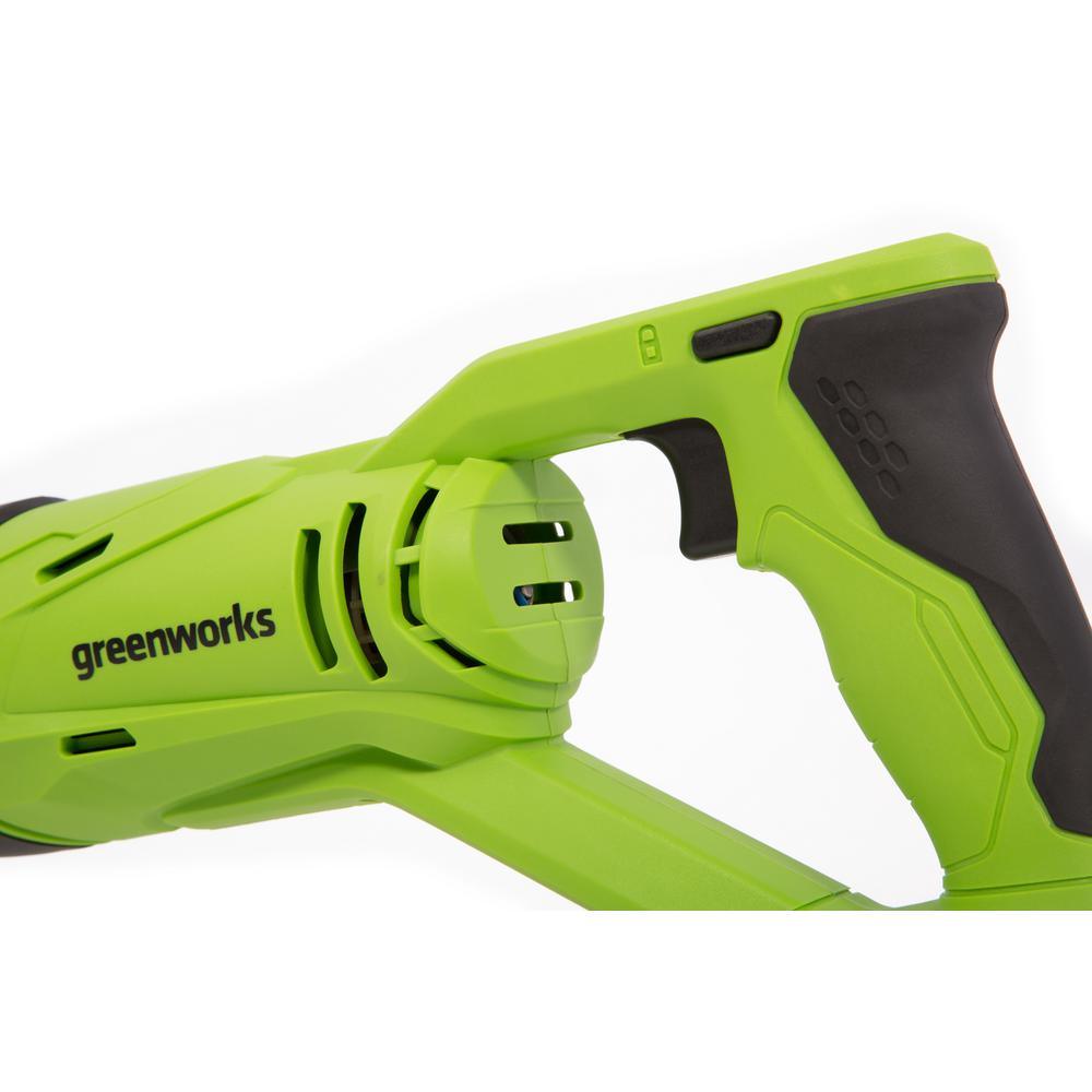 Greenworks 24-Volt lithium-ion battery (sold separately) provides 20% more power and 35% more run-time, and delivers fade-free power with no memory loss after charging