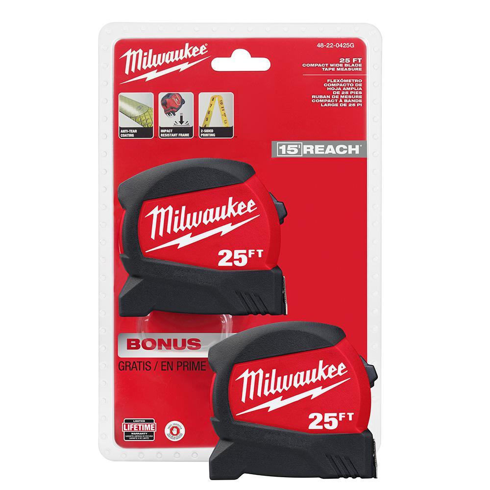 These Milwaukee 25 ft. Compact Tape Measures are designed for durability and ease of use on the jobsite. With up to 15 ft. of reach and anti-tear coating on the first 6 inches of the blade, these measuring tapes make taking measurements quick and accurate. They feature a 5-point reinforced frame for impact resistance and an integrated stamped steel belt clip for convenient carrying. Plus, they include lanyard-ready options for added convenience. The set includes two 25 ft. compact tape measures for all your measuring needs.
