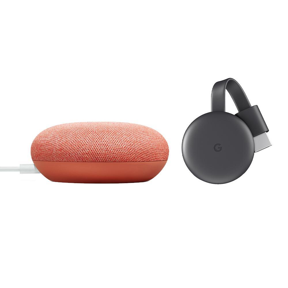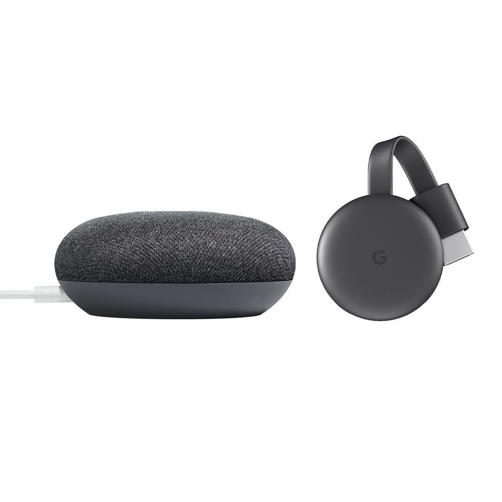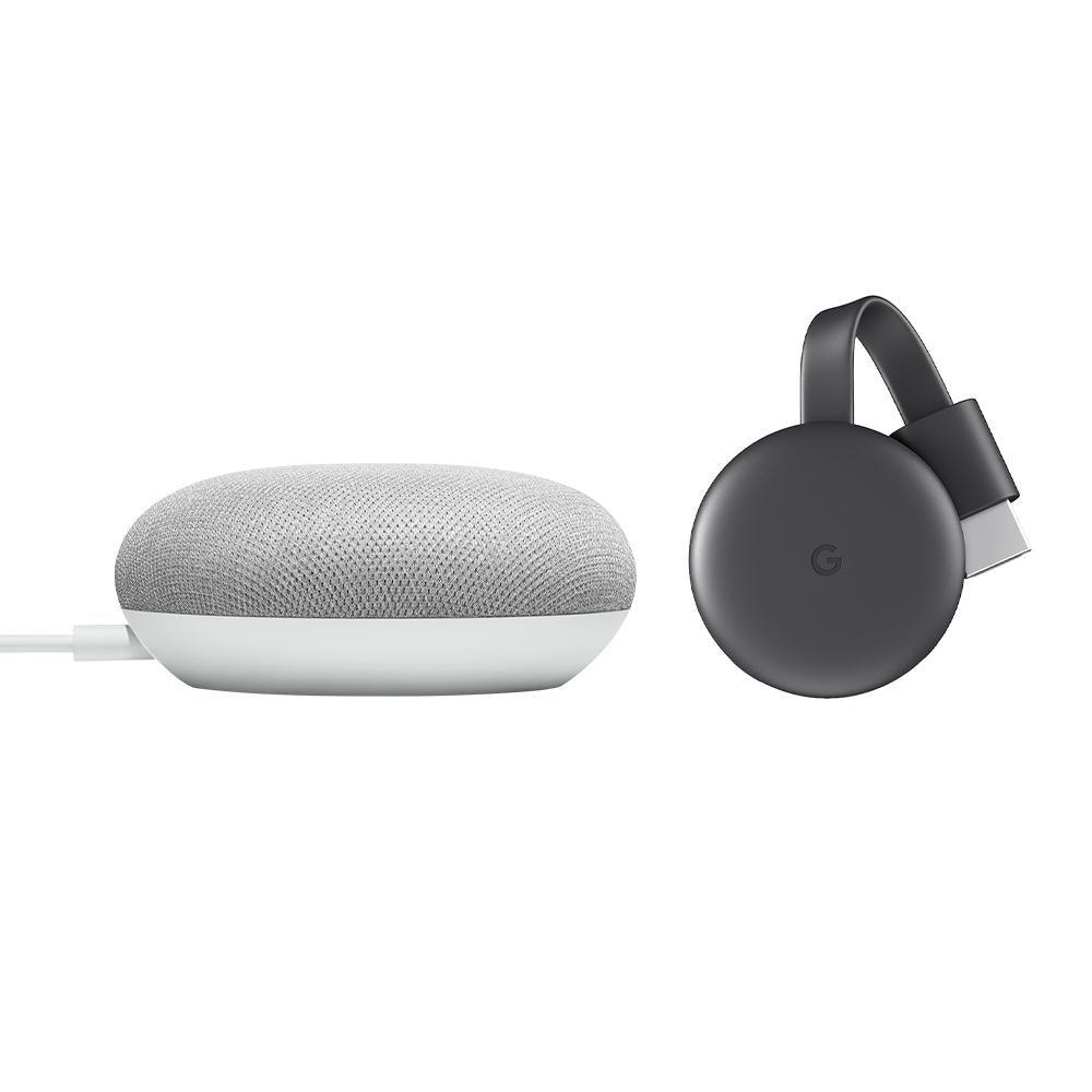 With Google Home Mini and Google Chromecast, use your voice to control our smart home. Just say Hey Google to stream from thousands of compatible apps, mute volume, rewind and more. Google Home Mini let's you play music from YouTube, Google Play, Spotify, Pandora and more. Ask your Google Assistant for help and get the best of Google weather, news or almost anything. Hear your personalized schedule, commute and reminders. Set timers and alarms. And even turn on the lights. Google Chromecast works with the streaming apps you know and love and is easy to install. And while streaming, you can still use your phone as you normally do. A powerful little helper Get hands-free help in any room with Google Home Mini. It's powered by the Google Assistant. You can ask it questions. Tell it to do things. It's your own personal Google. Control your home with just your voice using the built-in Google Assistant dim the lights, pause the TV, turn up the heat. Watch movies, shows, live TV, YouTube and photos streaming on your TV from all your family's devices. Easy install plug Chromecast into the HDMI port on your TV and to power and stream your favorite entertainment right from your phone with just a tap. Start streaming with just your voice just say what you want to watch from compatible apps and control your TV hands-free with Chromecast and Google smart speakers working seamlessly.