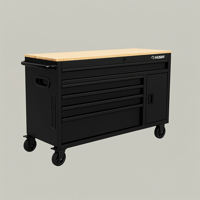 The Husky 56 in. Mobile Workbench combines style and functionality with its gloss white finish, solid hardwood top, and robust steel construction. Featuring ample storage, integrated power strip, and high weight capacity, it's perfect for any workspace.