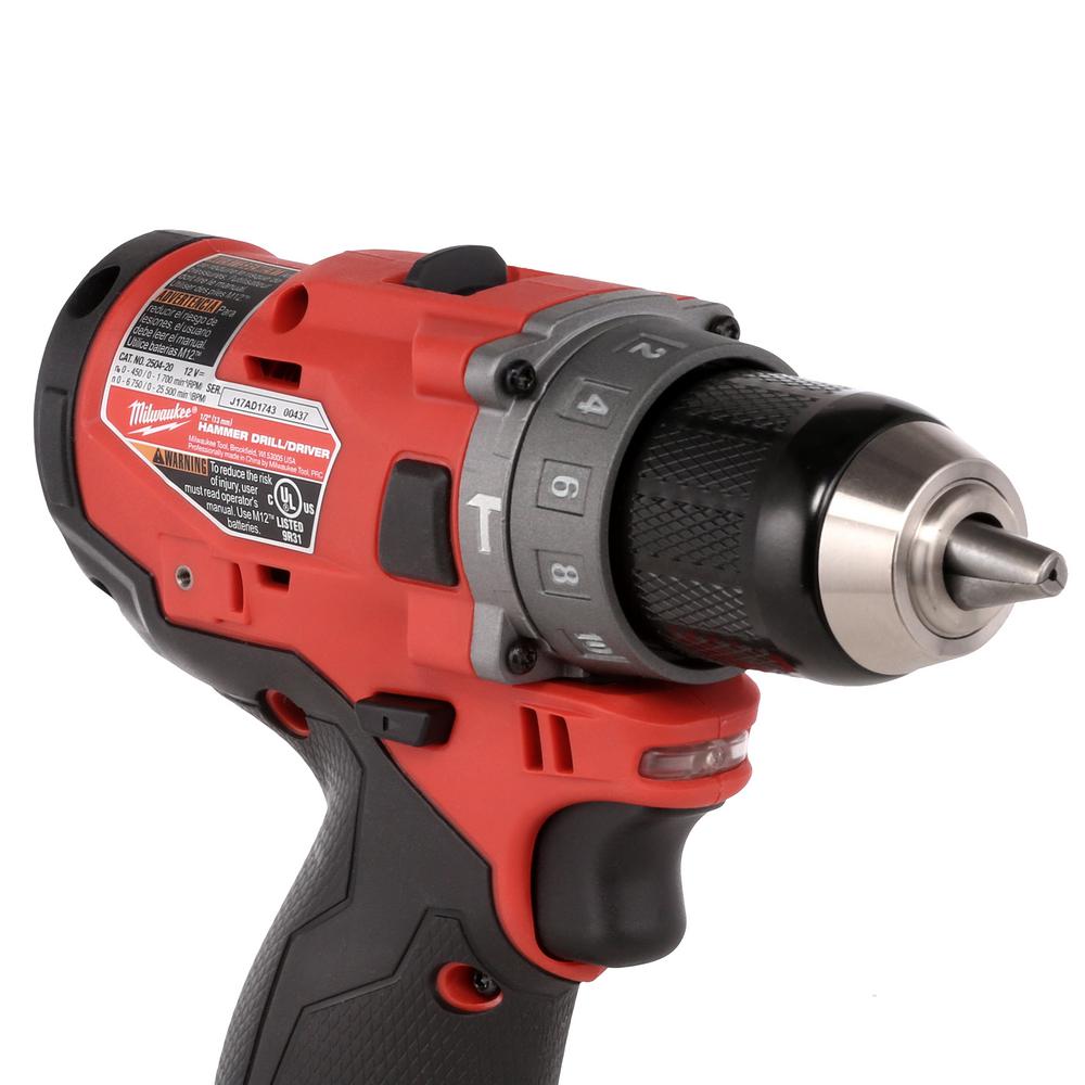 This 1/2 in. chuck, 12-Volt hammer drill is lightweight and compact with the power to perform a range of applications. Its brushless motor delivers 1700 RMPs and 350 in./lbs. of torque. This portable drill weighs just 2.3 lbs., which is great for overhead positions. It measures 6.6 in. L, helping you access tight spaces with ease. This reliable tool features REDLINK Plus Intelligence to protect it from overloading and overheating. It uses REDLITHIUM battery packs to deliver more work per charge. This power drill includes a 1/2 in. metal chuck for maximum grip and bit retention. It comes equipped with a drill driver and belt clip. Includes A Bonus M12 2.0 Ah Compact Battery Pack (48-11-2420).
