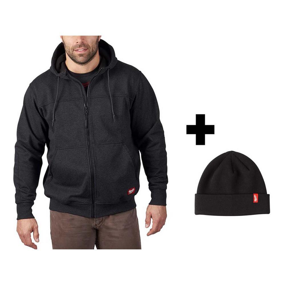 Stay comfortable and dry year-round in the Milwaukee NO DAYS OFF Hooded Sweatshirt. A comfortable fleece lining combined with wind and water resistance makes this the perfect choice for laying in any season. The fitted hood can be worn under a hard hat and an extended neck and interior storm flap offer superior protection from rain and snow. Durable polyester body material and double layer reinforcement of pocket edges and forearms extend product life even in demanding jobsite environments. Built for all conditions, the NO DAYS OFF Hooded Sweatshirt fights the rain when worn as an outer shell and provides wind protection and insulation when used as a versatile layer in extreme cold. Our cuffed beanie hats features a heavier yarn weight to block wind and provide you with an extra layer of warmth in cold weather conditions. This Milwaukee beanie is made from a durable 98% polyester/2% spandex mix that resists snagging. The cuffed knit beanie manages moisture to help prevent sweating and overheating. This warm winter hat is intended for cold weather use to keep you comfortable on the jobsite or during outdoor activities.
