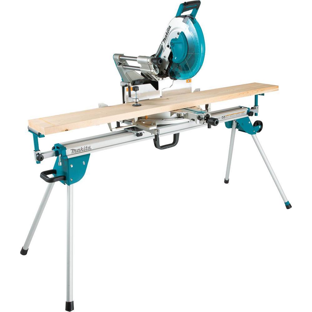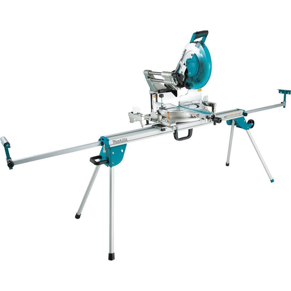 The Makita Folding Miter Saw Stand supports your Makita Miter Saw for easier material cutting. Made of aluminum, the stand weighs just under 40 lbs. for job site portability. Large rubber wheels and a side handle allows the stand to be transported around the job site. Folding legs provide compact storage. When folded, a carrying handle allows the user to single-handedly transport the stand. The stand can extend 151 in. to support material and can support up to 500 lbs. The durable aluminum feed roller and adjustable material stop are engineered for efficient repetitive cuts. The sliding rail design allows easy position of the miter saw (sold separately). An adjustable non-marring rubberized foot provides support when leveling the stand on uneven floor surfaces.