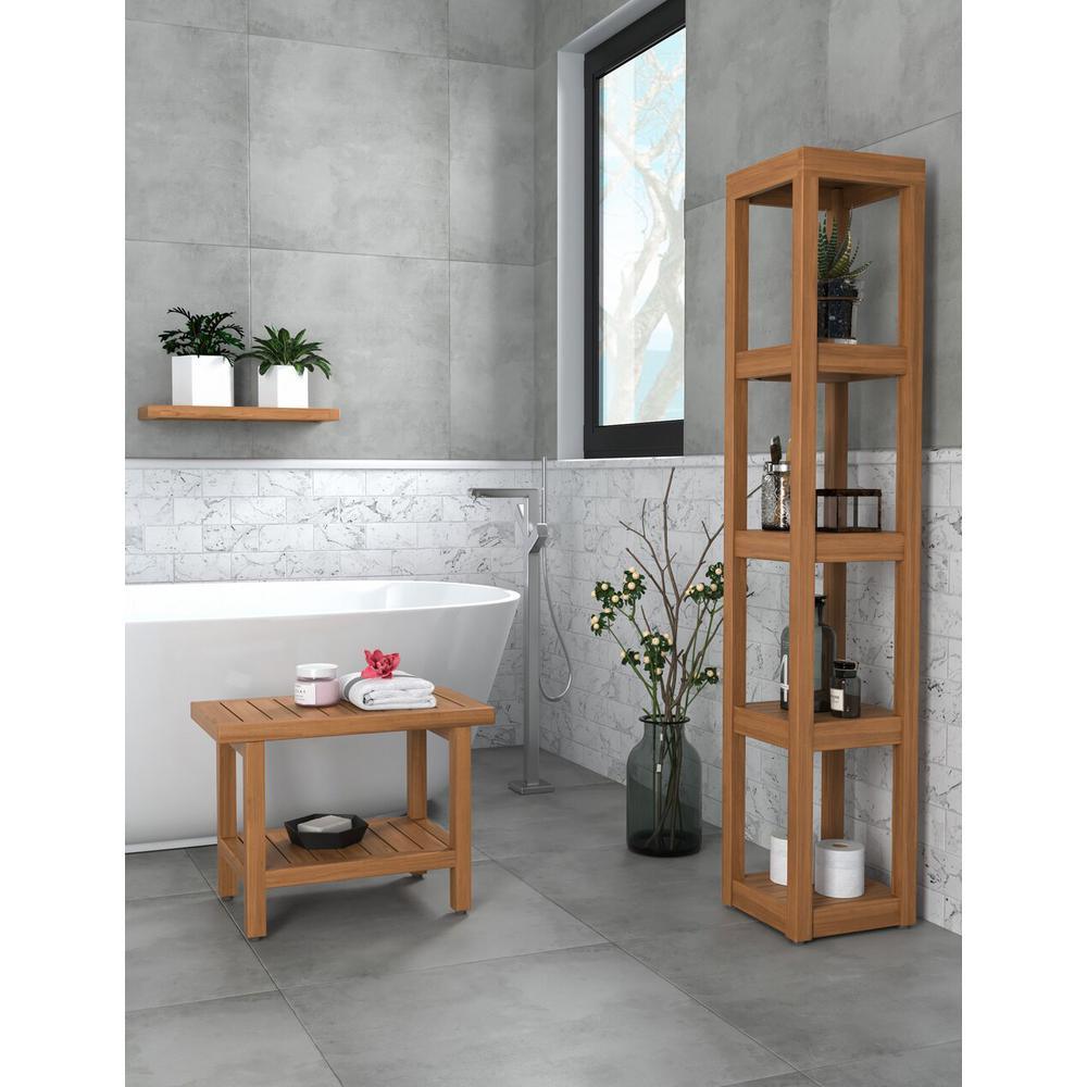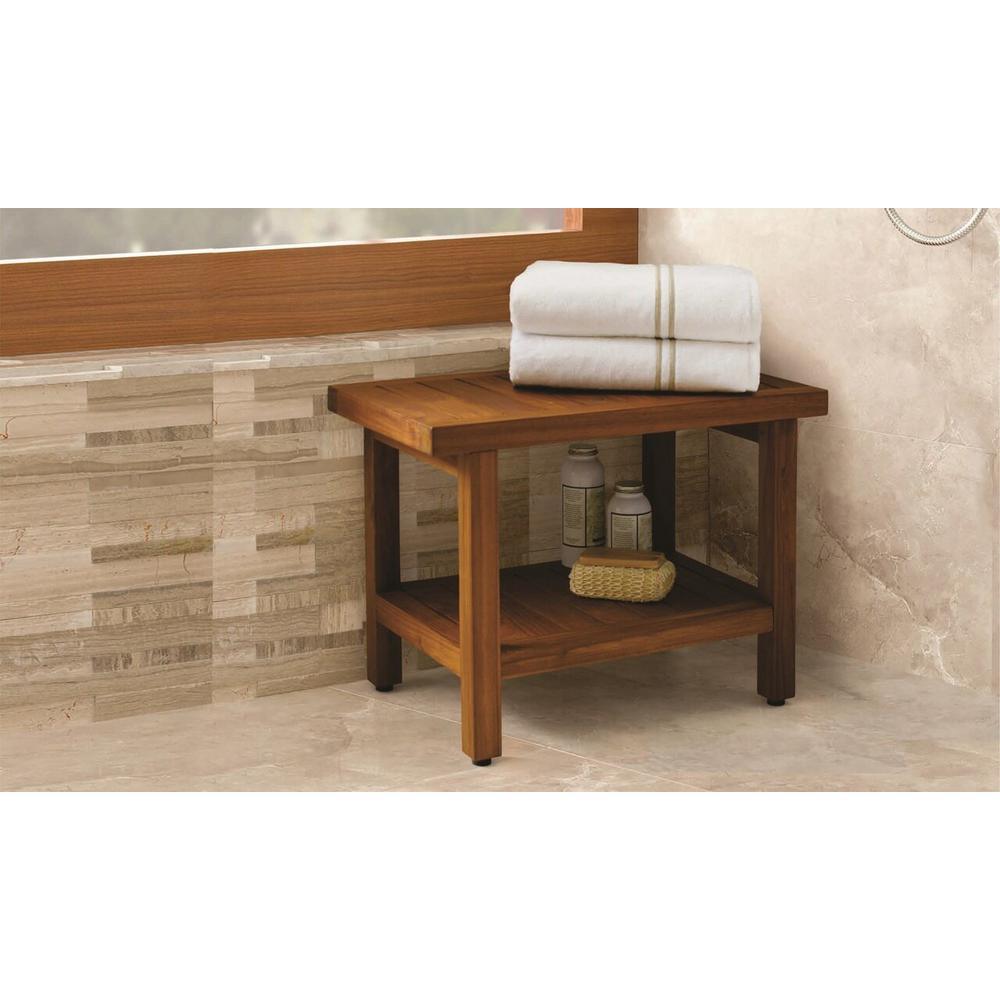 The beauty of teak with stability and strength in mind. This teak shower bench will blow you away with its high quality and aesthetic appeal. Handcrafted with farm-grown, sustainably-harvested teak wood, this AquaTeak teak shower seat is the ideal accessory for your bathroom, patio, or poolside. Leveling feet. Slip-resistant rubber feet. Wide, sturdy build. Convenient for use as a teak bath stool as well, this durable product comes with all stainless steel hardware and is naturally water resistant. Perfect for any area of your home or garden, we are so confident that you will love your teak shower bench that we offer a no-hassle, 30-day guarantee and a 5-year warranty on this and all of our teak furniture products (Some assembly required). Stainless steel hardware. Versatile. No hassle product guarantee. Product Dimensions: 24 in. x 14 in. x 18 in. Product Weight: 17.5 lbs.
