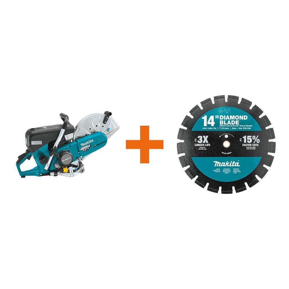 The 14 in. MM4 4-Stroke Power Cutter (model EK7651H) is the world's first 4-Stroke power cutter. The EK7651H is another innovation in Makita's expanding line-up of concrete solutions. The 4-Stroke EK7651H delivers several advantages over 2-Stroke. No oil mixing is required, so contractors get simplified operation and no more engine failure due to improper mix. The MM4 4-Stroke engine eliminates the need for separate mixed oil/fuel can. This Promotion also comes with a bonus 14 in. Diamond Blade, Segmented, Dual Purpose.