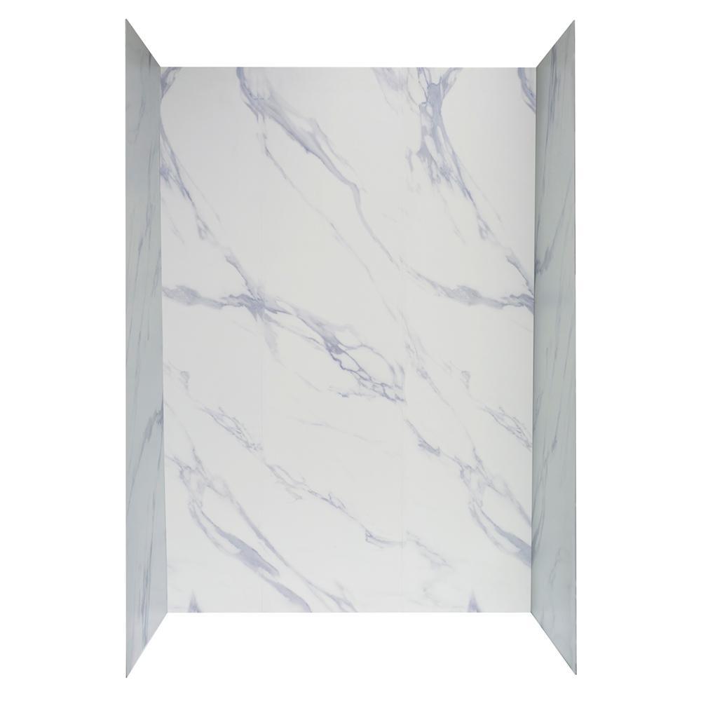 Shower wall kit includes 2 side panels measuring 34 in. W x 78 in. H and 3 back panels with finished measurements of 48 in. W x 78 in. H
